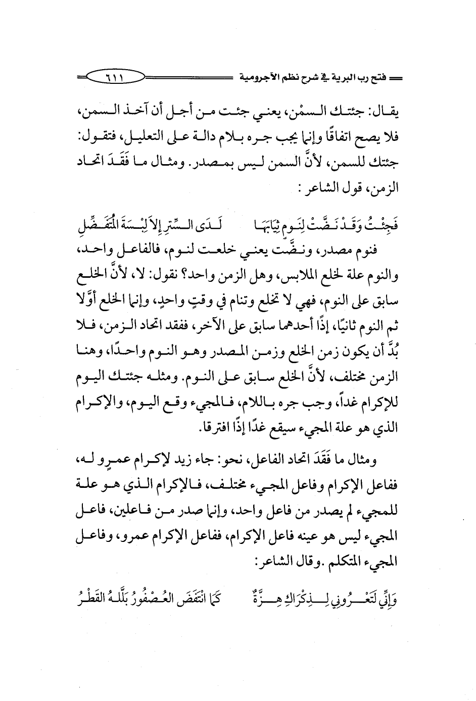 يقال: جئتك السمْن، يعني جئت من أجل أن آخذ السمن، اتفاقاً لا يصح وإنما يجب جره بلام دالة على التعليل، فتقول: جئتك للسمن، لأنَّ السمن ليس بمصدر. ومثال ما فَقَدَ اتحاد الزمن، قول الشاعر: