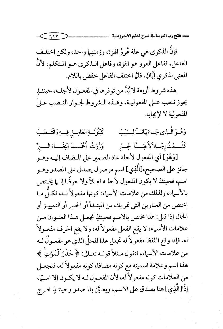 [وَهْوَ] أي المفعول لأجله عاد الضمير على المضاف إليه وهو جائز على الصحيح، [الَّذِي] اسم موصول يصدق على المصدر وهو اسم، فحينئذ لا يكون المفعول لأجله فعلاً ولا حرفًا إنما يختص بالأسماء، ولذلك من علامات الأسماء: كونها مفعولاً له، فكلُّ ما اختص من العناوين التي تمر بك من الابتداء أو الخبر أو التمييز أو الحال إذا قيل: هذا مختص بالاسم فحينئذٍ تجعل هذا العنوان من علامات الأسماء، لا يقع الفعل مفعولاً له، ولا يقع الحرف مفعولاً له، فإذا وقع اللفظ مفعولاً له تجعل هذا المحلَّ الذي هو مفعولٌ له من علامات الأسماء، فتقول مثلاً قوله تعالى: (حَذَرَ الْمَوْتِ) هذا اسم وعلامة اسميته مع كونه مضافا، كونه مفعولاً له، فتجعل من العلامات كونه مفعولاً له، لأن المفعول له لا يكون إلا اسمًا، إذًا [الَّذِي] هنا يصدق على الاسم، ويعيَّن بالمصدر حينئذٍ خرج