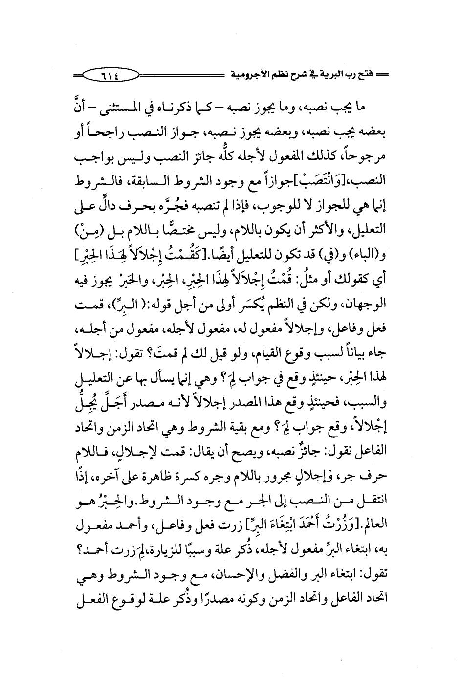 ما يجب نصبه، وما يجوز نصبه - كما ذكرناه في المستثنى - أن بعضه يجب نصبه، وبعضه يجوز نصبه، جواز النصب راجحاً أو مرجوحاً، كذلك المفعول لأجله كلُّه جائز النصب وليس بواجب النصب، [وَانْتَصَبْ] جوازاً مع وجود الشروط السابقة، فالشروط إنما هي للجواز لا للوجوب، فإذا لم تنصبه فجُرَّه بحرف دالٍّ على التعليل، والأكثر أن يكون باللام، وليس مختصًّا باللام بل (مِنْ) و (الباء) و (في) قد تكون للتعليل أيضًا. [كَقُمْتُ إِجْلاَلاً لِهَذَا الحِبْرِ] أي كقولك أو مثلُ: قُمْتُ إِجْلاَلاً لِهذَا الحِبْرِ، الحِبْر، والحَبرْ يجوز فيه الوجهان، ولكن في النظم يُكسَر أولى من أجل قوله: (البِرِّ)، قمت فعل وفاعل، وإجلالاً مفعول له، مفعول لأجله، مفعول من أجله، جاء بياناً لسبب وقوع القيام، ولو قيل لك لم قمتَ؟ تقول: إجلالاً لهذا الحِبْر، حينئذٍ وقع في جواب لِمَ؟ وهي إنما يسأل بها عن التعليل والسبب، فحينئذٍ وقع هذا المصدر إجلالاً لأنه مصدر أَجَلَّ يُجِلُّ إجْلالاً، مصدر وقع جواب لِمَ؟ حينئذٍ مع بقية الشروط وهي اتحاد الزمن واتحاد الفاعل نقول: جائزٌ نصبه، ويصح أن يقال: قمت لإجلالٍ، فاللام حرف جر، وإجلالٍ مجرور باللام وجره كسرة ظاهرة على آخره، إذًا انتقل من النصب إلى الجر مع وجود الشروط. والحِبْرِِ هو العالم. [وَزُرْتُ أَحْمَدَ ابْتِغَاءَ البِرِّ] زرت فعل وفاعل، وأحمد مفعول به، ابتغاء البرِّ مفعول لأجله، ذُكر علة وسببًا للزيارة، لِمَ زرت أحمد؟ نقول: ابتغاء البر والفضل والإحسان، مع وجود الشروط وهي اتحاد الفاعل واتحاد الزمن وكونه مصدرًا وذُكر علة لوقوع الفعل