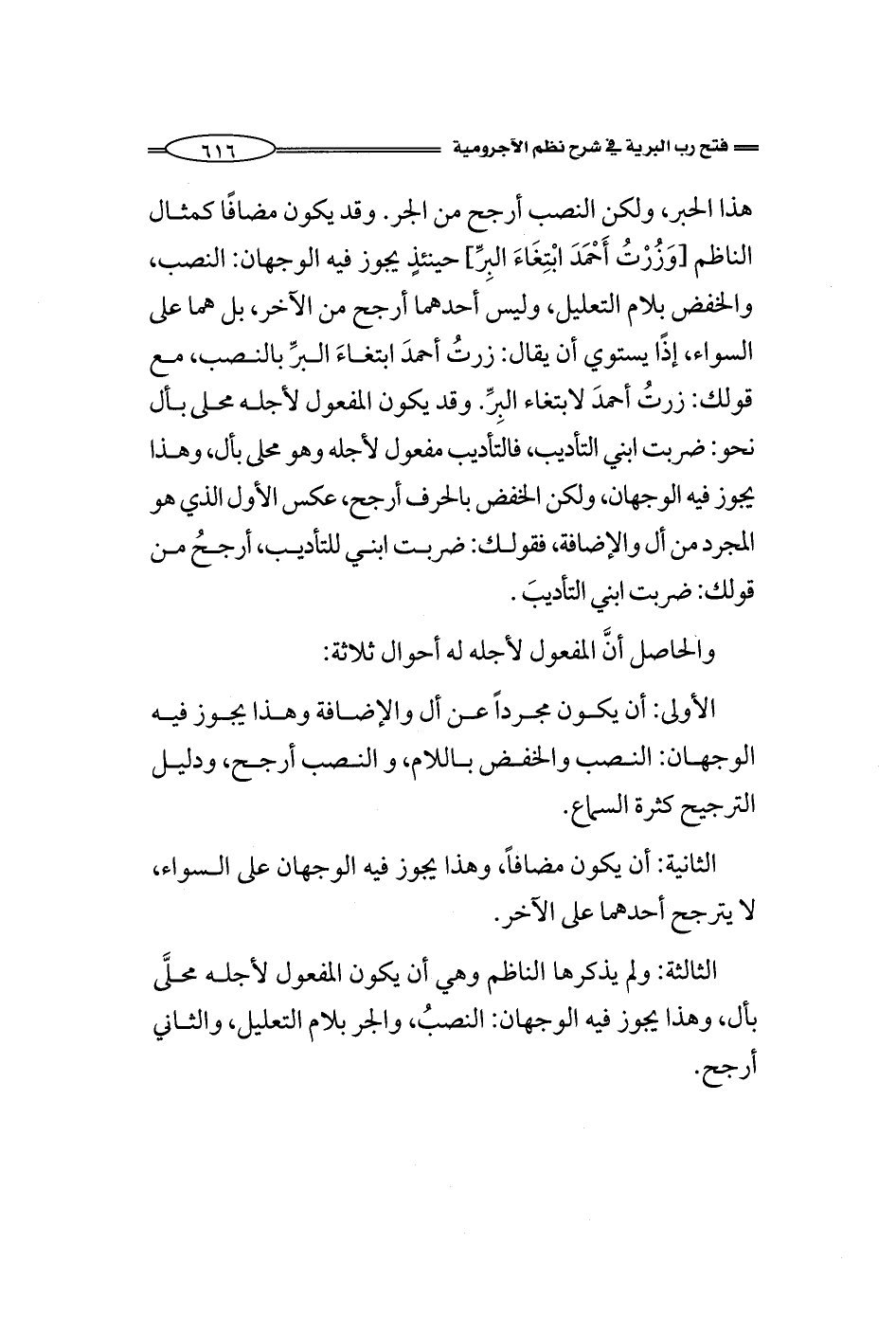 لهذا الحبر، ولكن النصب أرجح من الجر. وقد يكون مضافًا كمثال الناظم [وَزُرْتُ أَحْمَدَ ابْتِغَاءَ البِرِّ] حينئذٍ يجوز فيه الوجهان: النصب، والخفض بلام التعليل، وليس أحدهما أرجح من الآخر، بل هما على السواء، إذًا يستوي أن يقال: زرتُ أحمدَ ابتغاءَ البرِّ بالنصب، مع قولك: زرتُ أحمدَ لابتغاء البِرِّ. وقد يكون المفعول لأجله محلى بأل نحو: ضربت ابني التأديب، فالتأديب مفعول لأجله وهو محلى بأل، وهذا يجوز فيه الوجهان، ولكن الخفض بالحرف أرجح، عكس الأول الذي هو المجرد من أل والإضافة، فقولك: ضربت ابني للتأديب، أرجحُ من قولك: ضربت ابني التأديبَ.