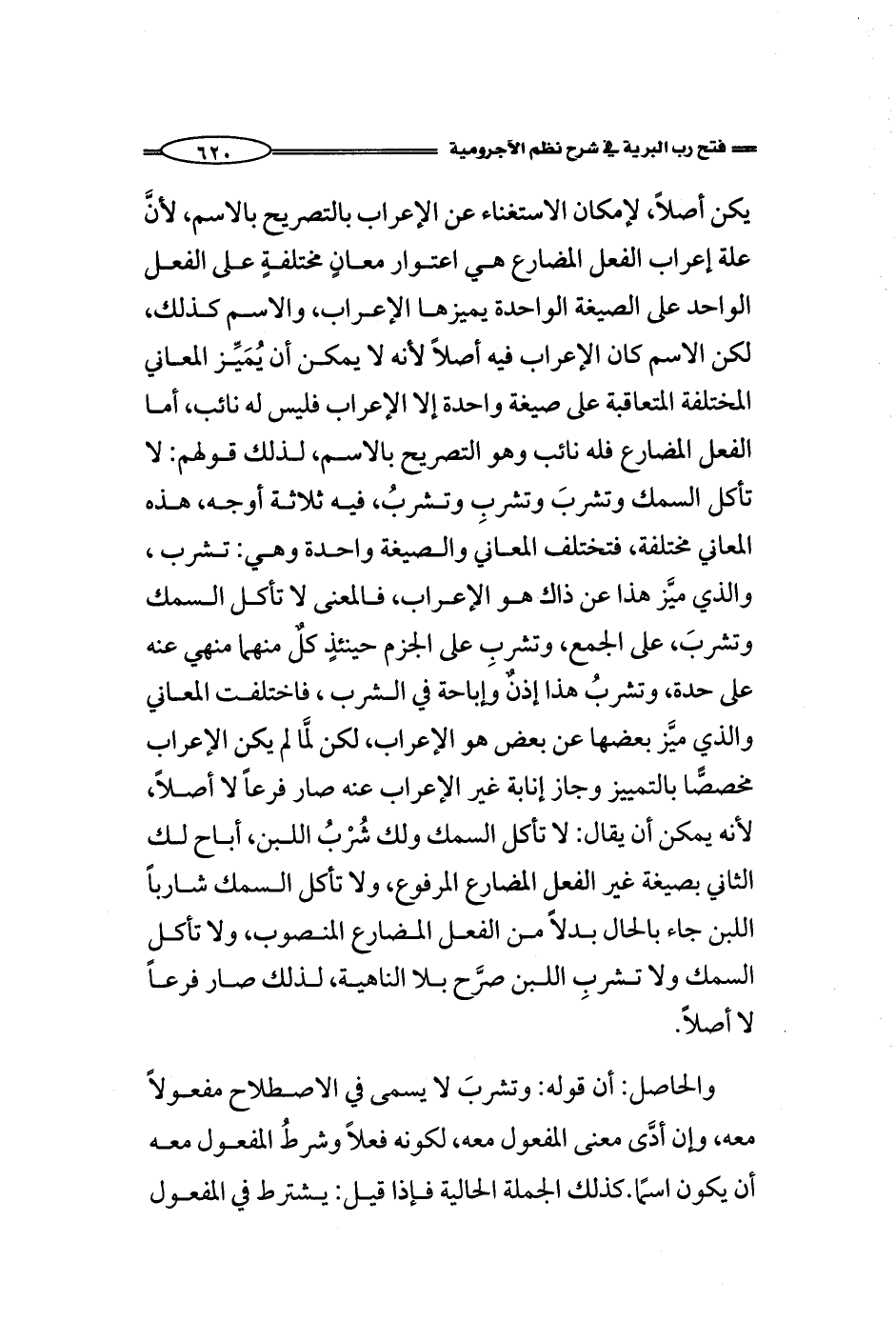 يكن أصلاً، لإمكان الاستغناء عن الإعراب بالتصريح بالاسم، لأنَّ علة إعراب الفعل المضارع هي اعتوار معانٍ مختلفةٍ على الفعل الواحد على الصيغة الواحدة يميزها الإعراب، والاسم كذلك، لكن الاسم كان الإعراب فيه أصلاً لأنه لا يمكن أن يُمَيِّز المعاني المختلفة المتعاقبة على صيغة واحدة إلا الإعراب فليس له نائب، أما الفعل المضارع فله نائب وهو التصريح بالاسم، لذلك قولهم: لا تأكل السمك وتشربَ وتشربِ وتشربُ، فيه ثلاثة أوجه، هذه المعاني مختلفة، فتختلف المعاني والصيغة واحدة وهي: تشرب والمعاني مختلفة، والذي ميَّز هذا عن ذاك هو الإعراب، فالمعنى لا تأكل السمك وتشربَ، على الجمع، وتشربِ على الجزم حينئذٍ كلٌ منهما منهي عنه على حدة، وتشربُ هذا إذنٌ وإباحة في الشرب وأكل السمك، فاختلفت المعاني والذي ميَّز بعضها عن بعض هو الإعراب، لكن لمَّا لم يكن الإعراب مخصصًّا بالتمييز وجاز إنابة غير الإعراب عنه صار فرعاً لا أصلاً، لأنه يمكن أن يقال: لا تأكل السمك ولك شُرْبُ اللبن، أباح لك الثاني بصيغة غير الفعل المضارع المرفوع، ولا تأكل السمك شارباً اللبن جاء بالحال بدلاً من الفعل المضارع المنصوب، ولا تأكل السمك ولا تشربِ اللبن صرَّح بلا الناهية، لذلك صار فرعاً لا أصلاً.