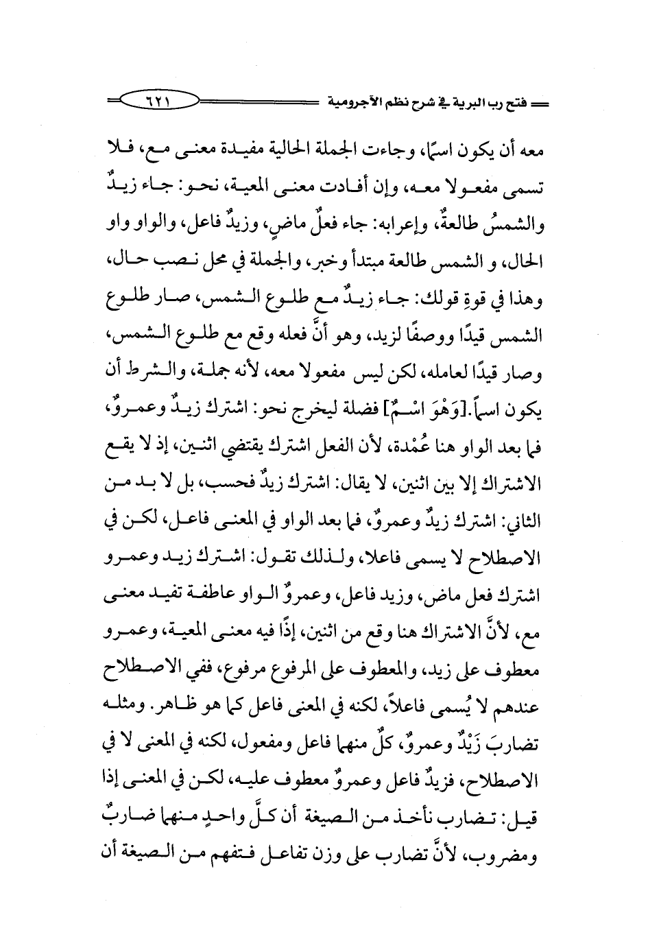 معه أن يكون اسمًا، فلو جاءت الجملة الحالية مفيدة معنى مع، فلا تسمى مفعولا معه، وإن أفادت معنى المعية، نحو: جاء زيدٌ والشمسُ طالعةٌٌ، وإعرابه: جاء فعلٌ ماضٍ، وزيدٌ فاعل، والواو واو الحال، والشمس طالعة مبتدأ وخبر، والجملة في محل نصب حال، وهذا في قوةِ قولك: جاء زيدٌ مع طلوع الشمس، صار طلوع الشمس قيدًا ووصفًا لزيد، وهو أنَّ فعله وقع مع طلوع الشمس، وصار قيدًا لعامله، لكن ليس مفعولا معه، لأنه جملة، والشرط أن يكون اسماً. [وَهْوَ اسْمٌ] فضلة ليخرج نحو: اشترك زيدٌ وعمروٌ، فما بعد الواو هنا عُمْدة، لأن الفعل اشترك يقتضي اثنين، لا يقع الاشتراك إلا بين اثنين، لا يقال: اشتراك زيدٌ فحسب، بل لا بد من الثاني: اشترك زيدٌ وعمروٌ، فما بعد الواو في المعنى فاعل، لكن في الاصطلاح لا يسمى فاعلا، ولذلك تقول: اشترك زيد وعمرو اشترك فعل ماض، وزيد فاعل، وعمروٌ الواو عاطفة تفيد معنى مع، لأنَّ الاشتراك هنا وقع من اثنين، إذًا فيه معنى المعية، وعمرو معطوف على زيد، والمعطوف على المرفوع مرفوع، ففي الاصطلاح عندهم لا يُسمى فاعلاً، لكنه في المعنى فاعل كما هو ظاهر. ومثله تضاربَ زَيْدٌ وعمروٌ، كلٌ منهما فاعل ومفعول، لكنه في المعنى لا في الاصطلاح، فزيدٌ فاعل وعمروٌ معطوف عليه، لكن في المعنى إذا قيل: تضارب نأخذ من الصيغة تضارب أن كلَّ واحدٍ منهما ضاربٌ ومضروب، لأنَّ تضارب على وزن تفاعل فتفهم من الصيغة أن