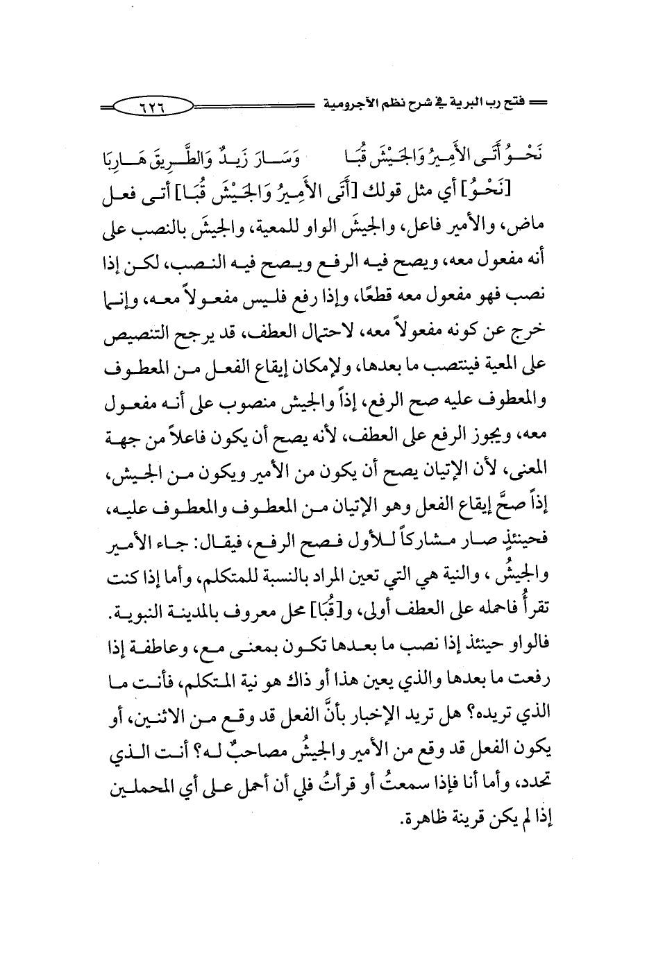 [نَحْوُ] أي مثل قولك [أَتَى الأَمِيرُ وَالجَيْشَ قُبَا] أتى فعل ماض، والأمير فاعل، والجيشَ الواو للمعية، والجيشَ بالنصب على أنه مفعول معه، ويصح فيه الرفع ويصح فيه النصب، لكن إذا نصب فهو مفعول معه قطعًا، وإذا رفع فليس مفعولاً معه، وإنما خرج عن كونه مفعولاً معه، لاحتمال العطف، قد يرجح التنصيص على المعية فينتصب ما بعدها، ولإمكانه إيقاع الفعل من المعطوف والمعطوف عليه صح الرفع، إذاً والجيش منصوب على أنه مفعول معه، ويجوز الرفع على العطف، لأنه يصح أن يكون فاعلاً من جهة المعنى، لأن الإتيان يصح أن يكون من الأمير ويكون من الجيش، إذاً صحَّ إيقاع الفعل وهو الإتيان من المعطوف والمعطوف عليه، فحينئذٍ صار مشاركاً للأول فصح الرفع، فيقال: جاء الأمير والجيشُ، والنية هي التي تعين المراد بالنسبة للمتكلم، وأما إذا كنت تقرأ فاحمله على العطف أولى، و [قُبَا] محل معروف بالمدينة النبوية. فالواو حينئذ إذا نصب ما بعدها تكون بمعنى مع، وعاطفة إذا رفعت ما بعدها والذي يعين هذا أو ذاك هو نية المتكلم، فأنت ما الذي تريده؟ هل تريد الإخبار بأنَّ الفعل قد وقع من الاثنين، أو يكون الفعل قد وقع من الأمير والجيشُ مصاحبٌ له؟ أنت الذي تحدد، وأما أنا فإذا سمعتُ أو قرأتُ فلي أن أحمل على أي المحملين إذا لم يكن قرينة ظاهرة.