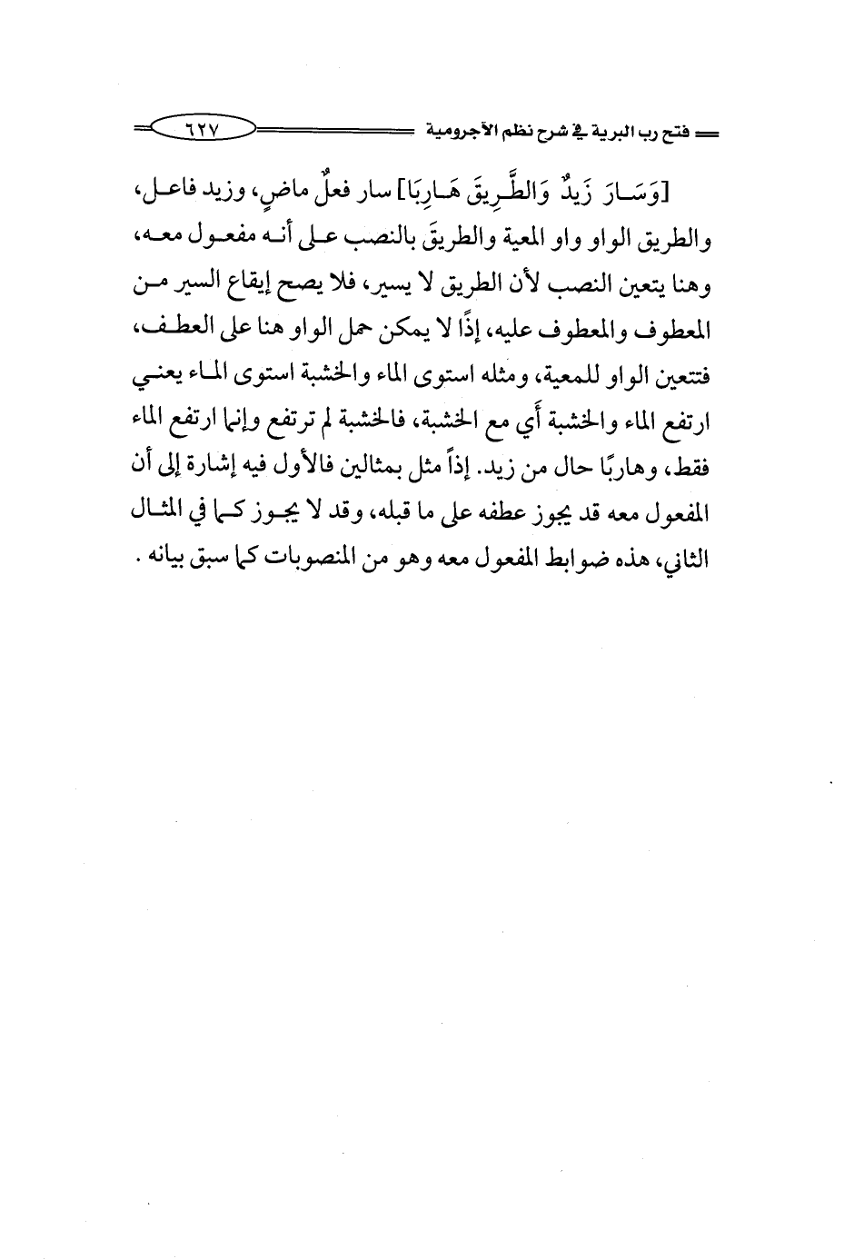 [وَسَارَ زَيدٌ وَالطَّرِيقَ هَارِبَا] سار فعلٌ ماضٍ، وزيد فاعل، والطريق الواو واو المعية والطريقَ بالنصب على أنه مفعول معه، وهنا يتعين النصب لأن الطريق لا يسير، فلا يصح إيقاع السير من المعطوف والمعطوف عليه، إذًا لا يمكن حمل الواو هنا على العطف، فتتعين الواو للمعية، ومثله استوى الماء والخشبة هذا المثال المشهور استوى الماء يعني ارتفع الماء والخشبة مع الخشبة، فالخشبة لم ترتفع وإنما ارتفع الماء فقط، وهاربًا حال من زيد. إذاً مثل بمثالين فالأول فيه إشارة إلى أن المفعول معه قد يجوز عطفه على ما قبله، وقد لا يجوز كما في المثال الثاني، هذه ضوابط المفعول معه وهو يعد من النواصب.