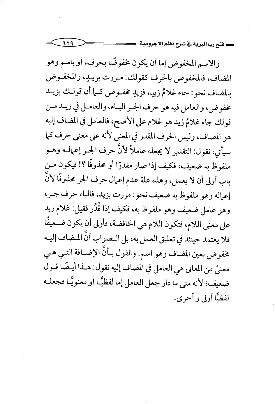 والاسم المخفوض إما أن يكون مخفوضًا بحرف، أو باسم وهو المضاف، فالمخفوض بالحرف كقولك: مررت بزيدٍ، والمخفوض بالمضاف نحو: جاء غلامُ زيدٍ، فزيدٍ مخفوض كما أن قولك بزيد مخفوض، والعامل فيه هو حرف الجر الباء، والعامل في زيد من قولك جاء غلامُ زيد هو غلام على الأصح، فالعامل في المضاف إليه هو المضاف، وليس الحرف المقدر في المعنى لأنه على معنى حرف كما سيأتي، نقول: التقدير لا يجعله عاملاً لأنَّ حرف الجر إعماله وهو ملفوظ به ضعيف، فكيف إذا صار مقدرًا أو محذوفًا؟! فيكون من باب أولى أن لا يعمل، وهذه علة عدم إعمال حرف الجر محذوفًا لأنَّ إعماله وهو ملفوظ به ضعيف نحو: مررت بزيد، فالباء حرف جر، وهو عامل ضعيف وهو ملفوظ به، فكيف إذا قُدِّر فقيل: غلام زيد على معنى اللام، فتكون اللام هي الخافضة، فأولى أن يكون ضعيفًا فلا يعتمد حينئذ في تعليق العمل به، بل الصواب أنَّ المضاف إليه مخفوض بعين المضاف وهو اسم. والقول بأنَّ الإضافة التي هي معنىً من المعاني هي العامل في المضاف إليه نقول: هذا أيضًا قول ضعيف؛ لأنه متى ما دار جعل العامل إما لفظيًّا أو معنويًّا فجعله لفظيًّا أولى وأحرى.