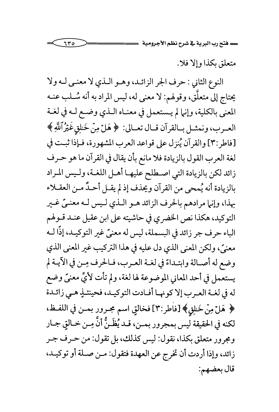 النوع الثاني: حرف الجر الزائد، وهو الذي لا معنى له ولا يحتاج إلى متعلَّق، وقولهم: لا معنى له، ليس المراد به أنه سُلب عنه المعنى بالكلية، وإنما لم يستعمل في معناه الذي وضع له في لغة العرب، ونمثل بالقرآن قال تعالى: ((هَلْمِنْ خَالِقٍ غَيْرُ اللَّهِ)) [فاطر:3] والقرآن يُنزل على قواعد العرب المشهورة، فإذا ثبت في لغة العرب القول بالزيادة فلا مانع بأن يقال في القرآن ما هو حرف زائد لكن بالزيادة التي اصطلح عليها أهل اللغة، وليس المراد بالزيادة أنه يُمحى من القرآن ويحذف، لم يقل أحدٌ من العقلاء بهذا، وإنما مرادهم بالحرف الزائد هو الذي ليس له معنىً غير التوكيد، هكذا نص الخضري في حاشيته على ابن عقيل عند قولهم الباء حرف جر زائد في البسملة، ليس له معنىً غير التوكيد، إذًا له معنىً، ولكن المعنى الذي دل عليه في هذا التركيب غير المعنى الذي وضع له أصالة وابتداءًا في لغة العرب، فالحرف مِن في الآية لم يستعمل في أحد المعاني الموضوعة لها لغة، ولم تأت لأيِّ معنىً وضع له في لغة العرب إلا كونها أفادت التوكيد، فحينئذٍ هي زائدة ((هَلْ مِنْ خَالِقٍ (3))) [فاطر:3] فخالقٍ اسم مجرور بمن في اللفظ، لكنه في الحقيقة ليس بمجرور بمن، قد يُظَنُّ أنَّ مِن خالقٍ جار ومجرور متعلق بكذا، نقول: لا ليس كذلك، بل تقول: من حرف جر زائد، وإذا أردت أن تخرج عن العهدة فتقول: من صلة أو توكيد، قال بعضهم: