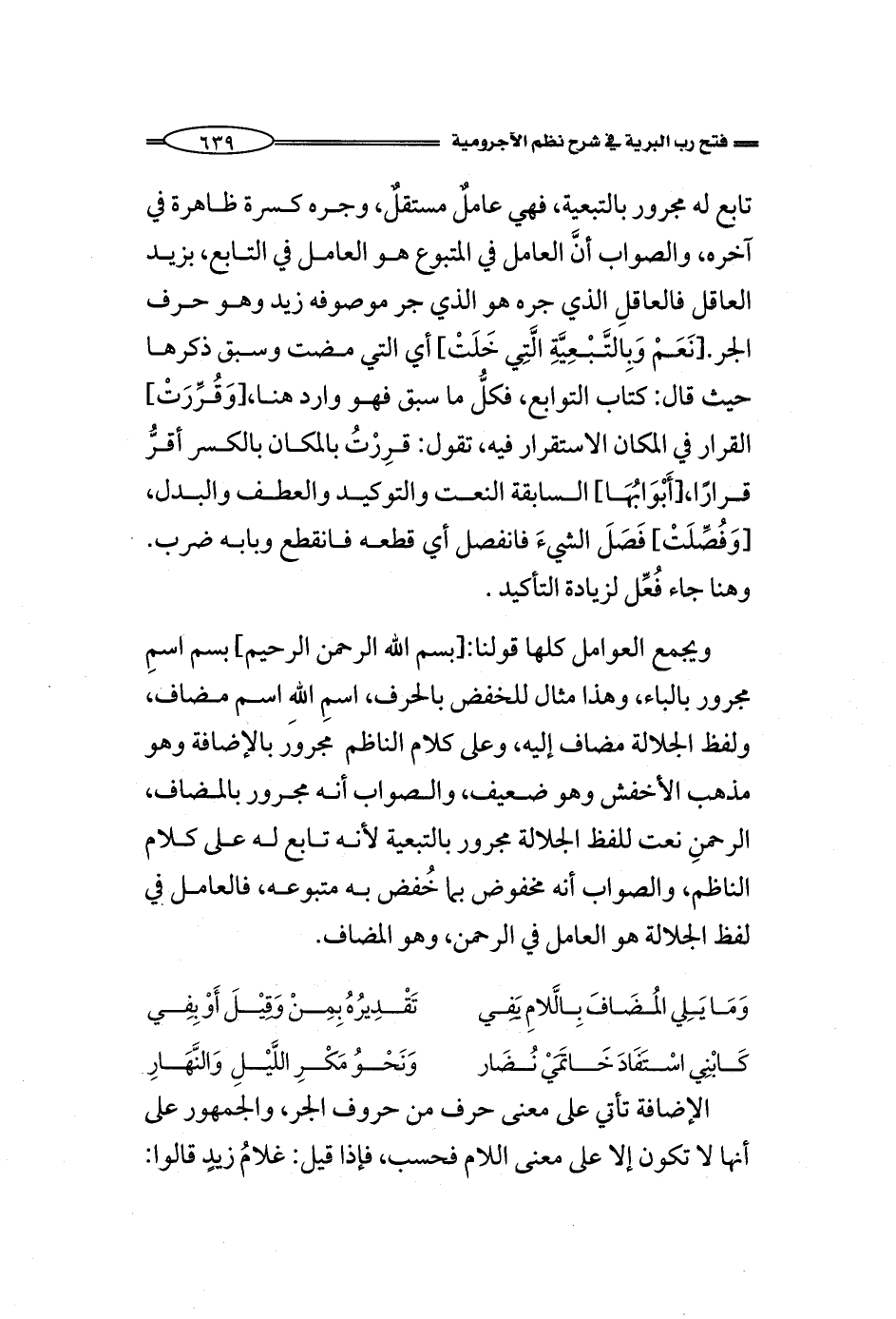 تابع له مجرور بالتبعية، فهي عاملٌ مستقلٌ، وعلامة جره كسرة ظاهرة في آخره، والصواب أنَّ العامل في المتبوع هو العامل في التابع، بزيد العاقل فالعاقلِ الذي جره هو الذي جر موصوفه زيد وهو حرف الجر. [نَعَمْ وَبِالتَّبْعِيَّةِ الَّتِي خَلَتْ] أي التي مضت وسبق ذكرها حيث قال: كتاب التوابع، فكلُّ ما سبق فهو وارد هنا، [وَقُرِّرَتْ] القرار في المكان الاستقرار فيه، تقول: قرِرْتُ بالمكان بالكسر أقرُّ قرارًا، [أَبْوَابُهَا] السابقة النعت والتوكيد والعطف والبدل، [وَفُصِّلَتْ] فَصَلَ الشيءَ فانفصل أي قطعه فانقطع وبابه ضرب. وهنا جاء فُعِّلَ للتأكيد.