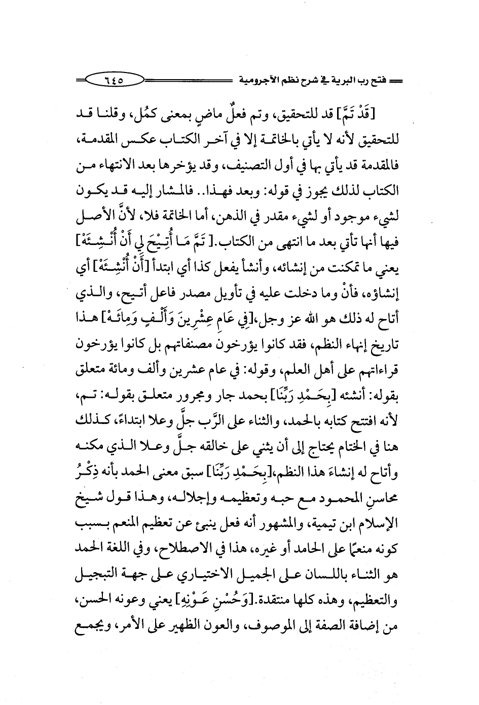 [قَدْ تَمَّ] قد للتحقيق، وتم فعلٌ ماضٍ بمعنى كمُل، وقلنا قد للتحقيق لأنه لا يأتي بالخاتمة إلا في آخر الكتاب عكس المقدمة، فالمقدمة قد يأتي بها في أول التصنيف، وقد يؤخرها بعد الانتهاء من الكتاب لذلك يجوز في قوله: وبعد فهذا .. فالمشار إليه قد يكون لشيء موجود أو لشيء مقدر في الذهن، أما الخاتمة فلا، لأنَّ الأصل فيها أنها تأتي بعد ما انتهى من الكتاب. [تَمَّ مَا أُتِيْحَ لِي أَنْ أُنْشِئَهْ] يعني ما تمكنت من إنشائه، وأنشأ يفعل كذا أي ابتدأ [أَنْ أُنْشِئَهْ] أي إنشاؤه، فأنْ وما دخلت عليه في تأويل مصدر فاعل أتيح، والذي أتاح له ذلك هو الله عز وجل، [فِي عَامِ عِشْرِينَ وَأَلْفٍ وَمِائَهْ] هذا تاريخ إنهاء النظم، فقد كانوا يؤرخون مصنفاتهم بل كانوا يؤرخون قراءاتهم على أهل العلم، وقوله: في عام عشرين وألف ومائة متعلق بقوله: أنشئه [بِحَمْدِ رَبِّنَا] بحمد جار ومجرور متعلق بقوله: تم، لأنه افتتح كتابه بالحمد، والثناء على الرَّب جلَّ وعلا ابتداءاً، كذلك هنا في الختام يحتاج إلى أن يثني على خالقه جلَّ وعلا الذي مكنه وأتاح له إنشاءَ هذا النظم، [بِحَمْدِ رَبِّنَا] سبق معنى الحمد أنه ذِكْرُ محاسنِ المحمود مع حبه وتعظيمه وإجلاله، وهذا قول شيخ الإسلام ابن تيمية، والمشهور أنه فعل ينبئ عن تعظيم المنعم بسبب كونه منعمًا على الحامد أو غيره، هذا في الاصطلاح، وفي اللغة الحمد هو الثناء باللسان على الجميل الاختياري على جهة التبجيل والتعظيم، وهذه كلها منتقدة. [وَحُسْنِ عَوْنِهِ] يعني وعونه الحسن، من إضافة الصفة إلى الموصوف، والعون الظهير على الأمر، والجمع