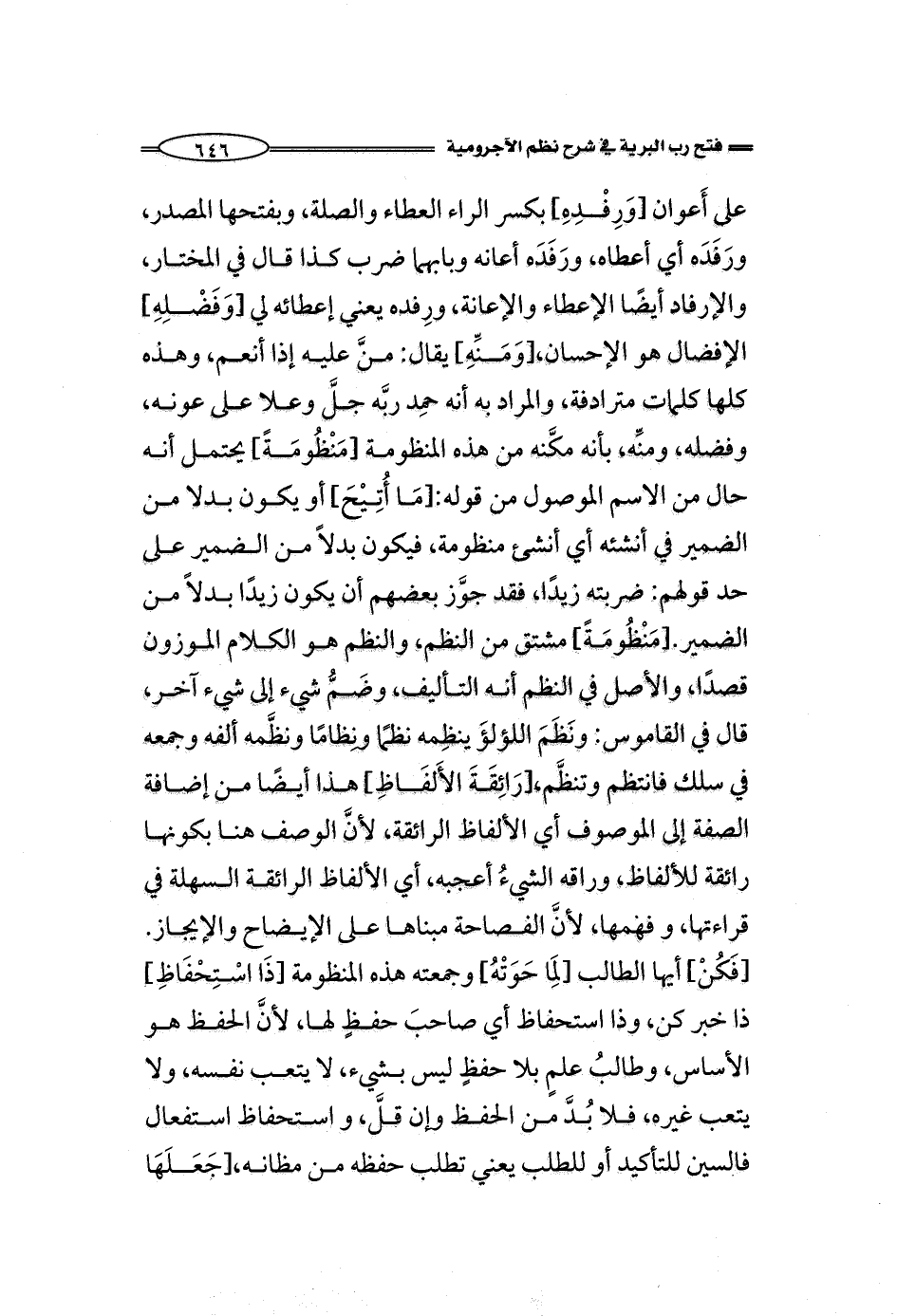 الأعوان [وَرِفْدِهِ] بكسر الراء العطاء والصلة، وبفتحها المصدر، ورَفده أي أعطاه، ورَفده أعانه وبابهما ضرب كذا قال في المختار، والإرفاد أيضًا الإعطاء والإعانة، ورِفده يعني إعطائه لي [وَفَضْلِهِ] الإفضال هو الإحسان، [وَمَنِّهِ] يقال: منَّ عليه إذا أنعم، وهذه كلها كلمات مترادفة، والمراد به أنه حمِد ربَّه جلَّ وعلا على عونه، وفضله، ومنِّه، بأنه مكَّنه من هذه المنظومة [مَنْظُومَةً] يحتمل أنه حال من الاسم الموصول من قوله: [مَا أُتِيْحَ] أو يكون بدلا من الضمير في أنشئه أي أنشئ منظومة، فيكون بدلاً من الضمير على حد قولهم: ضربته زيدًا، وجوَّز بعضهم أن يكون زيدًا بدلاً من الضمير. [مَنْظُومَةً] مشتق من النظم، والنظم هو الكلام الموزون قصدًا، والأصل في النظم أنه التأليف، وضَمُّ شيء إلى شيء آخر، قال في القاموس: ونَظَمَ اللؤلؤَ ينظِمه نظمًا ونِظامًا ونظَّمه ألفه وجمعه في سلك فانتظم وتنظَّم، [رَائِقَةَ الأَلفَاظِ] هذا أيضًا من إضافة الصفة إلى الموصوف أي الألفاظ الرائقة، لأنَّ الوصف هنا بكونها رائقة للألفاظ، وراقه الشيءُ أعجبه، أي الألفاظ الرائقة السهلة في قراءتها، وفهمها، لأنَّ الفصاحة مبناها على الإيضاح والإيجاز.