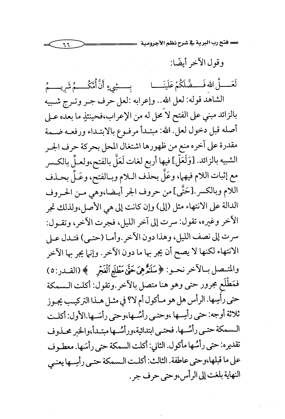 الشاهد قوله: لعل اللهِ .. وإعرابه: لعل حرف جر وترج شبيه بالزائد مبني على الفتح لا محل له من الإعراب، فحينئذٍ ما بعده على أصله قبل دخول لعل. الله: مبتدأ مرفوع بالابتداء ورفعه ضمة مقدرة على آخره منع من ظهورها اشتغال المحل بحركة حرف الجر الشبيه بالزائد. [وَلَعَلّ] فيها أربع لغات لَعَلَّ بالفتح، ولعلِّ بالكسر مع إثبات اللام فيهما، وعَلَّ بحذف اللام وبالفتح، وعَلِّ بحذف اللام وبالكسر. [حَتَّى] من حروف الجر أيضا، وهي من الحروف الدالة على الانتهاء مثل (إلى) وإن كانت إلى هي الأصل، ولذلك تجر الآخر وغيره، تقول: سرت إلى آخر الليل، فجرت الآخر، وتقول: سرت إلى نصف الليل، وهذا دون الآخر. وأما (حتى) فتدل على الانتهاء لكنها لا يصح أن يجر بها ما دون الآخر. وإنما يجر بها الآخر والمتصل بالآخر نحو: {سَلامٌ هِيَ حَتَّى مَطْلَعِ الْفَجْرِ} (القدر:5) فمَطْلَعِ مجرور حتى وهو هنا متصل بالآخر. وتقول: أكلت السمكة حتى رأسِها. الرأس هل هو مأكول أم لا؟ في مثل هذا التركيب يجوز ثلاثة أوجه: حتى رأسِها، وحتى رأسُها، وحتى رأسَها. الأول: أكلت السمكة حتى رأسُها. فحتى ابتدائية، ورأسُها مبتدأ، والخبر محذوف تقديره: حتى رأسُها مأكول. الثاني: أكلت السمكة حتى رأسَها. معطوف على ما قبلها، وحتى عاطفة. الثالث: أكلت السمكة حتى رأسِها يعني النهاية بلغت إلى الرأس، وحتى حرف جر.