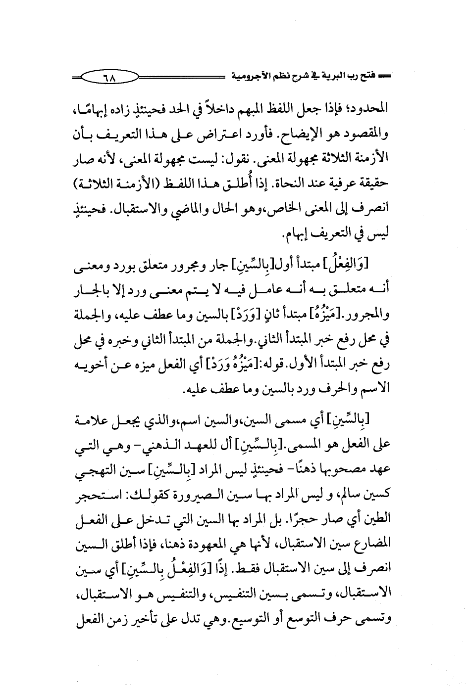 [بِالسِّينِ] أي مسمى السين، والسين اسم، والذي يجعل علامة على الفعل هو المسمى. [بِالسِّينِ] أل للعهد الذهني- وهي الذي عهد مصحوبها ذهنًا- فحينئذٍ ليس المراد [بِالسِّينِ] سين التهجي كسين سالم، وليس المراد بها سين الصيرورة كقولك: استحجر الطين أي صار حجرًا. بل المراد بها السين التي تدخل على الفعل المضارع سين الاستقبال، لأنها هي المعهودة ذهنا، فإذا أطلق السين انصرف إلى سين الاستقبال فقط. إذًا [وَالفِعْلُ بِالسِّينِ] أي سين الاستقبال، وتسمى بسين التنفيس، والتنفيس هو الاستقبال، وتسمى حرف التوسع أو التوسيع. وهي تدل على تأخير زمن الفعل