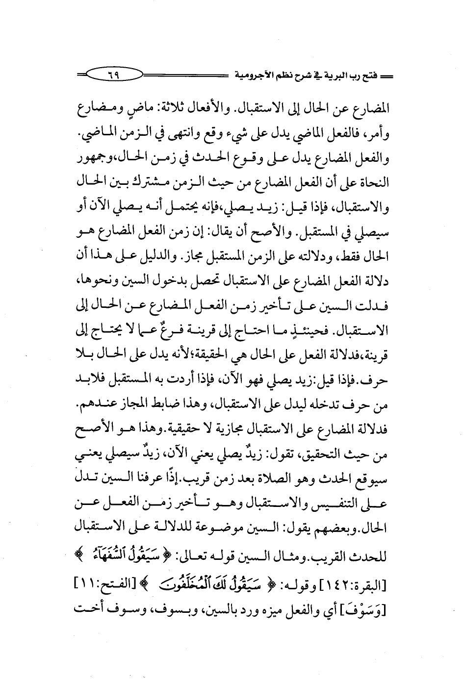 المضارع عن الحال إلى الاستقبال. الأفعال ثلاثة: ماضٍ ومضارع وأمر، فالفعل الماضي يدل على شيء وقع وانتهى في الزمن الماضي. والفعل المضارع يدل على وقوع الحدث في زمن الحال، وجمهور النحاة على أن الفعل المضارع من حيث الزمن مشترك بين الحال والاستقبال، فإذا قيل: زيد يصلي، فإنه يحتمل أنه يصلي الآن أو سيصلي في المستقبل. والأصح أن يقال: إن زمن فعل المضارع هو الحال فقط، ودلالته على الزمن المستقبل مجاز. والدليل على هذا أن دلالة الفعل المضارع على الاستقبال تحصل بدخول السين ونحوها، فدلت السين على تأخير زمن الفعل المضارع عن الحال إلى الاستقبال. فحينئذٍ ما احتاج إلى قرينة فرعٌ عما لا يحتاج إلى قرينة، فدلالة الفعل على الحال هي الحقيقة؛ لأنه يدل على الحال بلا حرف. فإذا قيل: زيد يصلي فهو الآن، فإذا أردت به المستقبل فلابد من حرف تدخله ليدل على الاستقبال، وهذا ضابط المجاز عندهم. فدلالة المضارع على الاستقبال مجازية لا حقيقية. وهذا هو الأصح من حيث التحقيق، تقول: زيدٌ يصلي يعني الآن، زيدٌ سيصلي يعني سيوقع الحدث وهو الصلاة بعد زمن قريب. إذًا عرفنا السين تدل على التنفيس والاستقبال وهو تأخير زمن الفعل عن الحال. وبعضهم يقول: السين موضوعة للدلالة على الاستقبال للحدث القريب. ومثال السين قوله تعالى: (سَيَقُولُ السُّفَهَاءُ) [البقرة:142] وقوله: (سَيَقُولُ لَكَ الْمُخَلَّفُونَ) [الفتح:11] [وَسَوْفَ] أي والفعل ميزه ورد بالسين، وبسوف، وسوف أخت