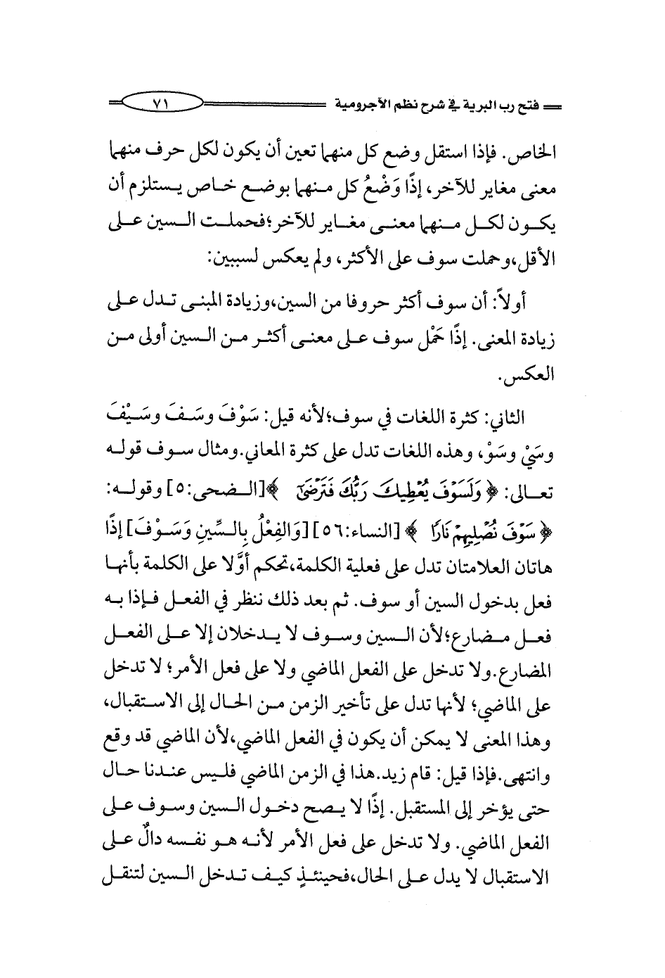 الثاني: كثرة اللغات في سوف؛ لأنه قيل: سَوْفَ وسَفْ وسيف وسَي وسَوْ، وهذه اللغات تدل على كثرة المعاني. ومثال سوف قوله تعالى: (وَلَسَوْفَ يُعْطِيكَ رَبُّكَ فَتَرْضَى) [الضحى:5] وقوله: (سَوْفَ نُصْلِيهِمْ نَارًا) [النساء:56] [وَالفِعْلُ بِالسِّينِ وَسَوْفَ] إذًا هاتان العلامتان تدل على فعلية الكلمة، تحكم أوَّلا على الكلمة بأنها فعل بدخول السين أو سوف. ثم بعد ذلك ننظر في الفعل فإذا به فعل مضارع؛ لأن السين وسوف لا يدخلان إلا على الفعل المضارع. ولا تدخل على الفعل الماضي ولا على فعل الأمر؛ لا تدخل على الماضي؛ لأنها تدل على تأخير الزمن من الحال إلى الاستقبال، وهذا المعنى لا يمكن أن يكون في الفعل الماضي، لأن الماضي قد وقع وانتهى. فإذا قيل: قام زيد. هذا في الزمن الماضي فليس عندنا حال حتى يؤخر إلى المستقبل. إذًا لا يصح دخول السين وسوف على الفعل الماضي. ولا تدخل على فعل الأمر لأنه هو نفسه دالٌ على الاستقبال لا يدل على الحال، فحينئذٍ كيف تدخل السين لتنقل