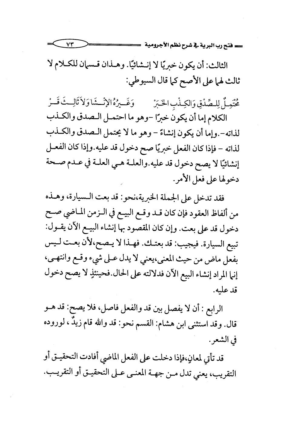 فقد تدخل على الجملة الخبرية، نحو: قد بعت السيارة، وهذه من ألفاظ العقود فإن كان قد وقع البيع في الزمن الماضي صح دخول قد على بعت. وإن كان المقصود بها إنشاء البيع الآن يقول: تبيع السيارة. فيجيب: قد بعتك. فهذا لا يصح، لأن بعت ليس بفعل ماض من حيث المعنى، يعني لا يدل على شيء وقع وانتهى، إنما المراد إنشاء البيع الآن فدلالته على الحال. فحينئذٍ لا يصح دخول قد عليه.