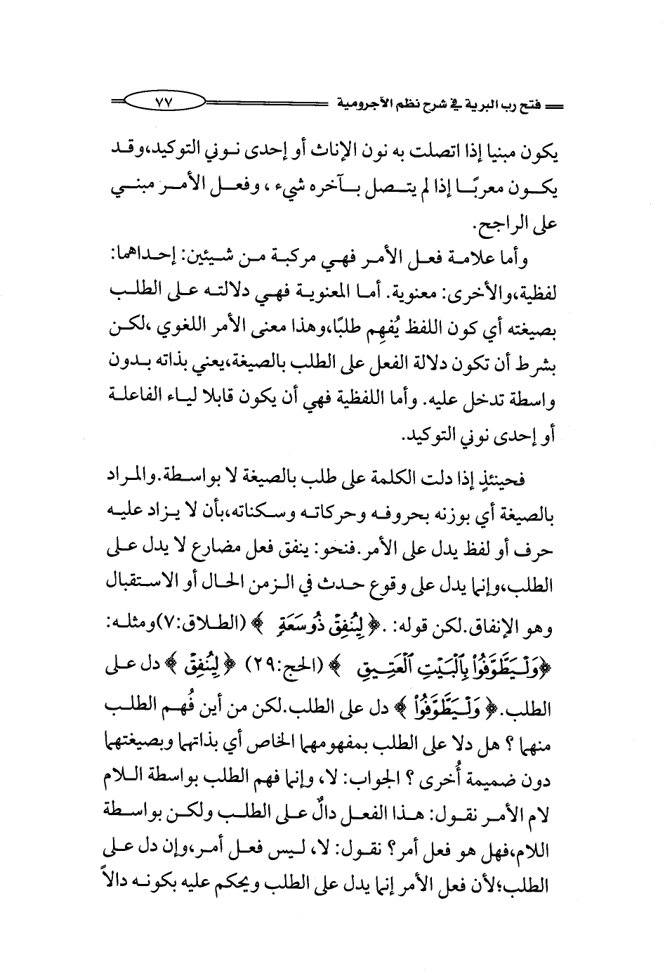 فحينئذٍ إذا دلت الكلمة على طلب بالصيغة لا بواسطة. والمراد بالصيغة أي بوزنه بحروفه وحركاته وسكناته، بأن لا يزاد عليه حرف أو لفظ يدل على الأمر. فنحو: ينفق فعل مضارع لا يدل على الطلب، وإنما يدل على وقوع حدث في الزمن الحال أو الاستقبال وهو الإنفاق. لكن قوله:. {لِيُنْفِقْ ذُو سَعَةٍ} (الطلاق:7) ومثله: {وَلْيَطَّوَّفُوا بِالْبَيْتِ الْعَتِيقِ} (الحج:29) {لِيُنْفِقْ} دل على الطلب. {وَلْيَطَّوَّفُوا} دل على الطلب. لكن من أين فُهم الطلب منهما؟ هل دلا على الطلب بمفهومهما الخاص أي بذاتهما وبصيغتهما دون ضميمة أُخرى؟ الجواب: لا، وإنما فهم الطلب بواسطة اللام لام الأمر نقول: هذا الفعل دالٌ على الطلب ولكن بواسطة اللام، فهل هو فعل أمر؟ نقول: لا، ليس فعل أمر، وإن دل على الطلب؛ لأن فعل الأمر إنما يدل على الطلب ويحكم عليه بكونه دالاً
