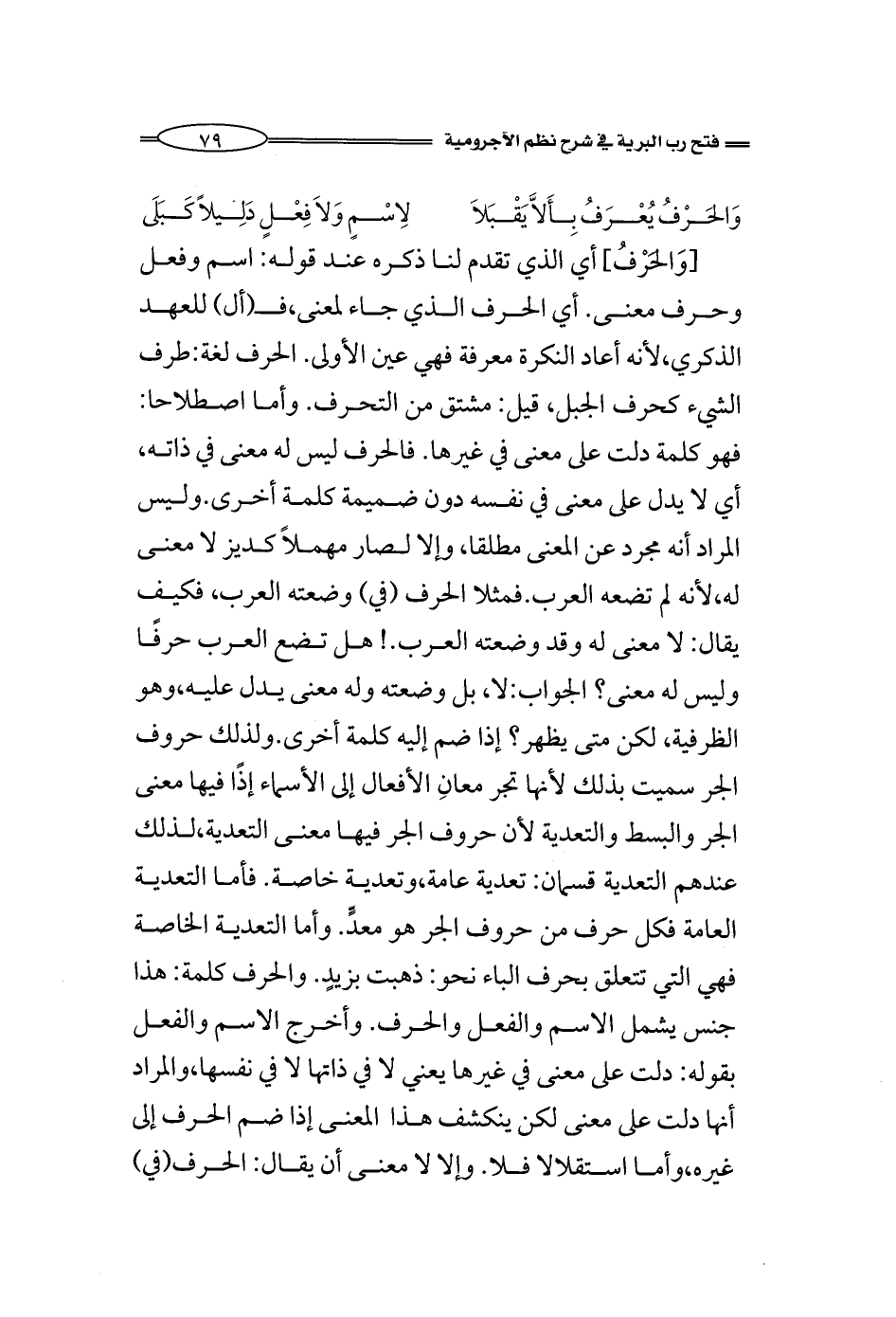 [وَالحَرْفُ] أي الذي تقدم لنا ذكره عند قوله: اسم وفعل وحرف معنى. أي الحرف الذي جاء لمعنى، فـ (أل) للعهد الذكري، لأنه أعاد النكرة معرفة فهي عين الأولى. الحرف لغة: طرف الشيء كحرف الجبل، قيل: مشتق من التحرف. وأما اصطلاحا: فهو كلمة دلت على معنى في غيرها. فالحرف ليس له معنى في ذاته، أي لا يدل على معنى في نفسه دون ضميمة كلمة أخرى. وليس المراد أنه مجرد عن المعنى مطلقا، وإلا لصار مهملاً كديز لا معنى له، لأنه لم تضعه العرب. فمثلا الحرف (في) وضعته العرب، فكيف يقال: لا معنى له وقد وضعته العرب.! هل تضع العرب حرفًا وليس له معنى؟ الجواب: لا، بل وضعته وله معنى يدل عليه، وهو الظرفية، لكن متى يظهر؟ إذا ضم إليه كلمة أخرى. ولذلك حروف الجر سميت بذلك لأنها تجر معانِ الأفعال إلى الأسماء إذًا فيها معنى الجر والبسط والتعدية لأن حروف الجر فيها معنى التعدية، لذلك عندهم التعدية قسمان: تعدية عامة، وتعدية خاصة. فأما التعدية العامة فكل حرف من حروف الجر هو معدٍّ. وأما التعدية الخاصة فهي التي تتعلق بحرف الباء نحو: ذهبت بزيدٍ. والحرف كلمة: هذا جنس يشمل الاسم والفعل والحرف. دلت على معنى في غيرها يعني لا في ذاتها لا في نفسها، والمراد أنها دلت على معنى لكن ينكشف هذا المعنى إذا ضم الحرف إلى غيره، وأما استقلالا فلا. وإلا لا معنى أن يقال: الحرف (في)