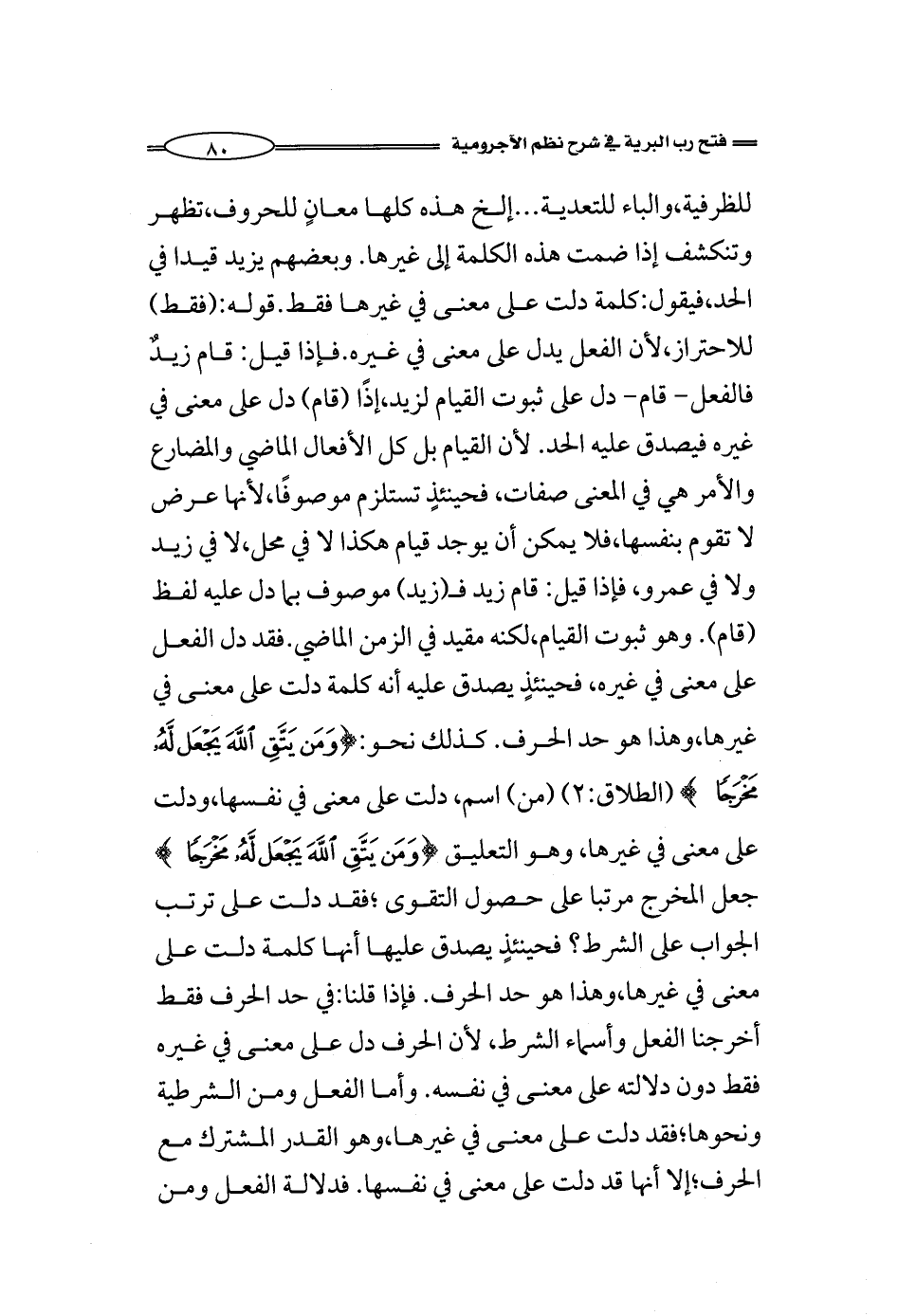 للظرفية، والباء للتعدية ... إلخ هذه كلها معاني للحروف، تظهر وتنكشف إذا ضمت هذه الكلمة إلى غيرها. وبعضهم يزيد قيدا في الحد، فيقول: كلمة دلت على معنى في غيرها فقط. قوله: (فقط) للاحتراز، لأن الفعل يدل على معنى في غيره. فإذا قيل: قام زيدٌ فالفعل- قام- دل على ثبوت القيام لزيد، إذًا (قام) دل على معنى في غيره فيصدق عليه الحد. لأن القيام بل كل الأفعال الماضي والمضارع والأمر هي في المعنى صفات، فحينئذٍ تستلزم موصوفًا، لأنها عرض لا تقوم بنفسها، فلا يمكن أن يوجد قيام هكذا لا في محل، لا في زيد ولا في عمرو، فإذا قيل: قام زيد فـ (زيد) موصوف بما دل عليه لفظ (قام). وهو ثبوت القيام، لكنه مقيد في الزمن الماضي. فقد دل الفعل على معنى في غيره، فحينئذٍ يصدق عليه أنه كلمة دلت على معنى في غيرها، وهذا هو حد الحرف. كذلك نحو: {وَمَنْ يَتَّقِ اللَّهَ يَجْعَلْ لَهُ مَخْرَجاً} (الطلاق:2) (من) اسم، دلت على معنى في نفسها، ودلت على معنى في غيرها، وهو التعليق {وَمَنْ يَتَّقِ اللَّهَ يَجْعَلْ لَهُ مَخْرَجاً} جعل المخرج مرتبا على حصول التقوى؛ فقد دلت على ترتب الجواب على الشرط؟ فحينئذٍ يصدق عليها أنها كلمة دلت على معنى في غيرها، وهذا هو حد الحرف. فإذا قلنا: في حد الحرف فقط أخرجنا الفعل وأسماء الشرط، لأن الحرف دل على معنى في غيره فقط دون دلالته على معنى في نفسه. أما الفعل ومن الشرطية ونحوها؛ فقد دلت على معنى في غيرها، وهو القدر المشترك مع الحرف؛ إلا أنها قد دلت على معنى في نفسها. فدلالة الفعل ومن