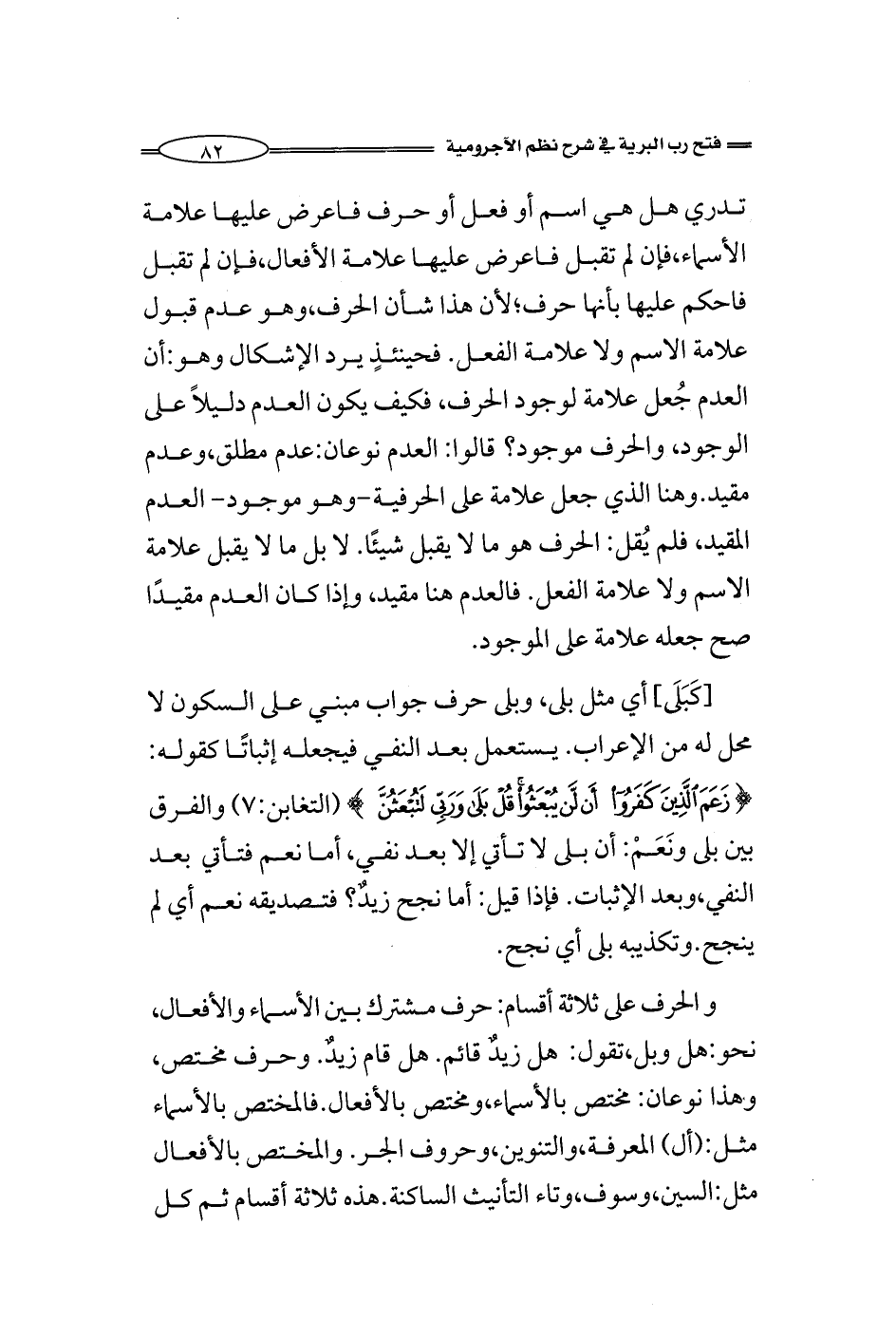 [كَبَلَى] أي مثل بلى، وبلى حرف جواب مبني على السكون لا محل له من الإعراب. يستعمل بعد النفي فيجعله إثباتًا كقوله: {زَعَمَ الَّذِينَ كَفَرُوا أَنْ لَنْ يُبْعَثُوا قُلْ بَلَى وَرَبِّي لَتُبْعَثُنَّ} (التغابن:7) والفرق بين بلى ونَعَمْ: أن بلى لا تأتي إلا بعد نفي، أما نعم فتأتي بعد النفي، وبعد الإثبات. فإذا قيل: أما نجح زيدٌ؟ فتصديقه نعم أي لم ينجح. وتكذيبه بلى أي نجح.