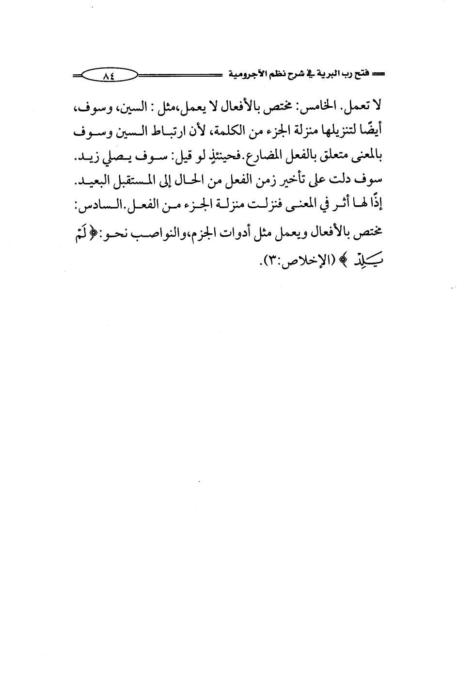 لا تعمل. الخامس: مختص بالأفعال لا يعمل، مثل: السين، وسوف، أيضًا لتنزيلها منزلة الجزء من الكلمة، لأن ارتباط السين وسوف بالمعنى متعلق بالفعل المضارع. فحينئذٍ لو قيل: سوف يصلي زيد. سوف دلت على تأخير زمن الفعل من الحال إلى المستقبل البعيد. إذًا لها أثر في المعنى فنزلت منزلة الجزء من الفعل. السادس: مختص بالأفعال ويعمل مثل أدوات الجزم، والنواصب نحو: {لَمْ يَلِدْ} (الإخلاص:3).