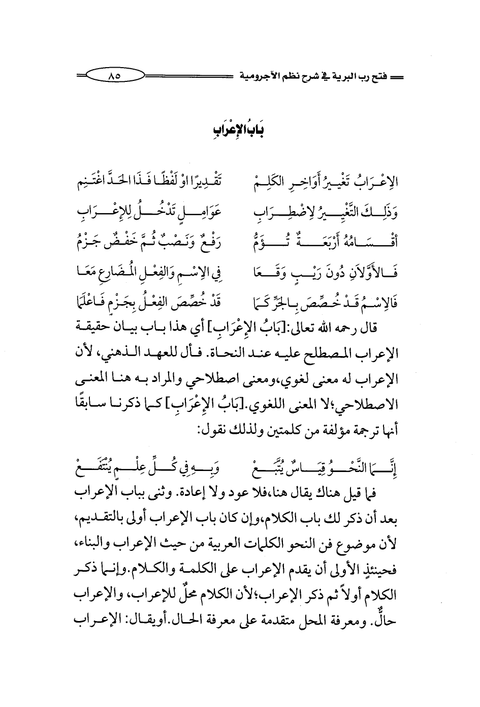 الاِعْرَابُ تَغْييرُ أَوَاخِرِ الكَلِمْ ... تَقْدِيرًا اوْ لَفْظًا فَذَا الحَدَّ اغْتَنِم