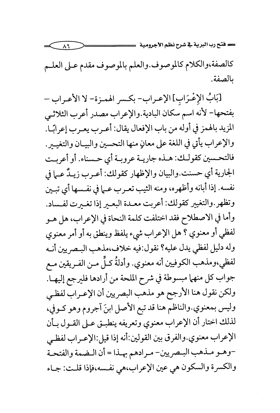 [بَابُ الإِعْرَابِ] الإعراب- بكسر الهمزة- لا الأعراب - بفتحها- لأنه اسم سكان البادية. والإعراب مصدر أعرب الثلاثي المزيد بالهمز في أوله من باب الإفعال يقال: أعرب يعرب إعرابًا. والإعراب يأتي في اللغة على معانٍ منها التحسين والبيان والتغيير. فالتحسين كقولك: هذه جارية عروبة أي حسناء. أو أعربت الجارية أي حسنت. والبيان والإظهار كقولك: أعرب زيدٌ عما في نفسه. إذا أبانه وأظهره، ومنه الثيب تعرب عما في نفسها أي تبين وتظهر. والتغيير كقولك: أعربت معدة البعير إذا تغيرت لفساد. وأما في الاصطلاح فقد اختلفت كلمة النحاة في الإعراب، هل هو لفظي أم معنوي؟ هل الإعراب شيء يلفظ وينطق به أم أمر معنوي وله دليل لفظي يدل عليه؟ نقول: فيه خلاف، مذهب البصريين أنه لفظي، ومذهب الكوفيين أنه معنوي. وأدلةُ كلٍّ من الفريقين مع جواب كل منهما مبسوطة في شرح الملحة من أرادها فليرجع إليها. ولكن نقول هنا الأرجح هو مذهب البصريين أن الإعراب لفظي وليس بمعنوي. والناظم هنا قد تبع الأصل ابنَ آجروم وهو كوفي، لذلك اختار أن الإعراب معنوي وتعريفه ينطبق على القول بأن الإعراب معنوي. والفرق بين القولين: أنه إذا قيل: الإعراب لفظي-وهو مذهب البصريين- مرادهم بهذا = أن الضمة والفتحة والكسرة والسكون هي عين الإعراب، هي نفسه، فإذا قلت: جاء