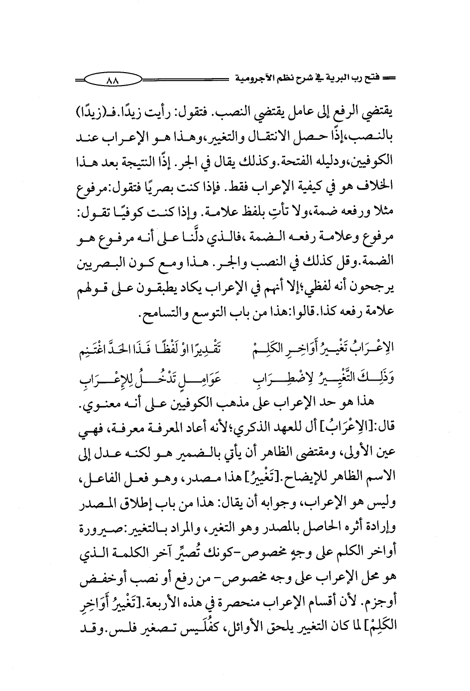 الاِعْرَابُ تَغْييرُ أَوَاخِرِ الكَلِمْ ... تَقْدِيرًا اوْ لَفْظًا فَذَا الحَدَّ اغْتَنِم