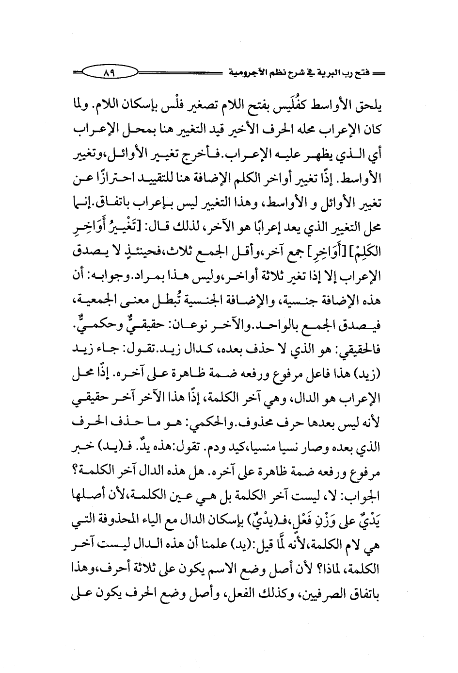 يلحق الأواسط كفُلَيس بفتح اللام تصغير فلْس بإسكان اللام. ولما كانت علامة الإعراب محلها الحرف الأخير قيد التغيير هنا بمحل الإعراب أي الذي يظهر عليه علامة الإعراب. فأخرج تغيير الأوائل، وتغيير الأواسط. إذًا تغيير أواخر الكلم الإضافة هنا للتقييد احترازًا عن تغيير الأوائل والأواسط، وهذا التغيير ليس بإعراب باتفاق. إنما محل التغيير الذي يعد إعرابًا هو الآخر، لذلك قال: [تَغْييرُ أَوَاخِرِ الكَلِمْ] [أَوَاخِرِ] جمع آخر، وأقل الجمع ثلاث، فحينئذٍ لا يصدق الإعراب إلا إذا تغير ثلاثة أواخر، وليس هذا بمراد. وجوابه: أن هذه الإضافة جنسية، والإضافة الجنسية تُبطل معنى الجمعية، فيصدق الجمع بالواحد. والآخر نوعان: حقيقيٌّ وحكميٌّ. فالحقيقي: هو الذي لا حذف بعده، كدال زيد. تقول: جاء زيد (زيد) هذا فاعل مرفوع ورفعه ضمة ظاهرة على آخره. إذًا محل الإعراب هو الدال، وهي آخر الكلمة، إذًا هذا الآخر آخر حقيقي لأنه ليس بعدها حرف محذوف. والحكمي: هو ما حذف الحرف الذي بعده وصار نسيا منسيا، كيد ودم. تقول: هذه يدٌ. فـ (يد) خبر مرفوع ورفعه ضمة ظاهرة على آخره. هل هذه الدال آخر الكلمة؟ الجواب: لا، ليست آخر الكلمة بل هي عين الكلمة، لأن أصلها يَدْيٌ على وَزْنِ فَعْلٍ، فـ (يدْيٌ) بإسكان الدال مع الياء المحذوفة التي هي لام الكلمة، لأنه لَمَّا قيل: (يد) علمنا أن هذه الدال ليست آخر الكلمة، لماذا؟ لأن أصل وضع الاسم يكون على ثلاثة أحرف، وهذا باتفاق الصرفيين، وكذلك الفعل، وأصل وضع الحرف يكون على
