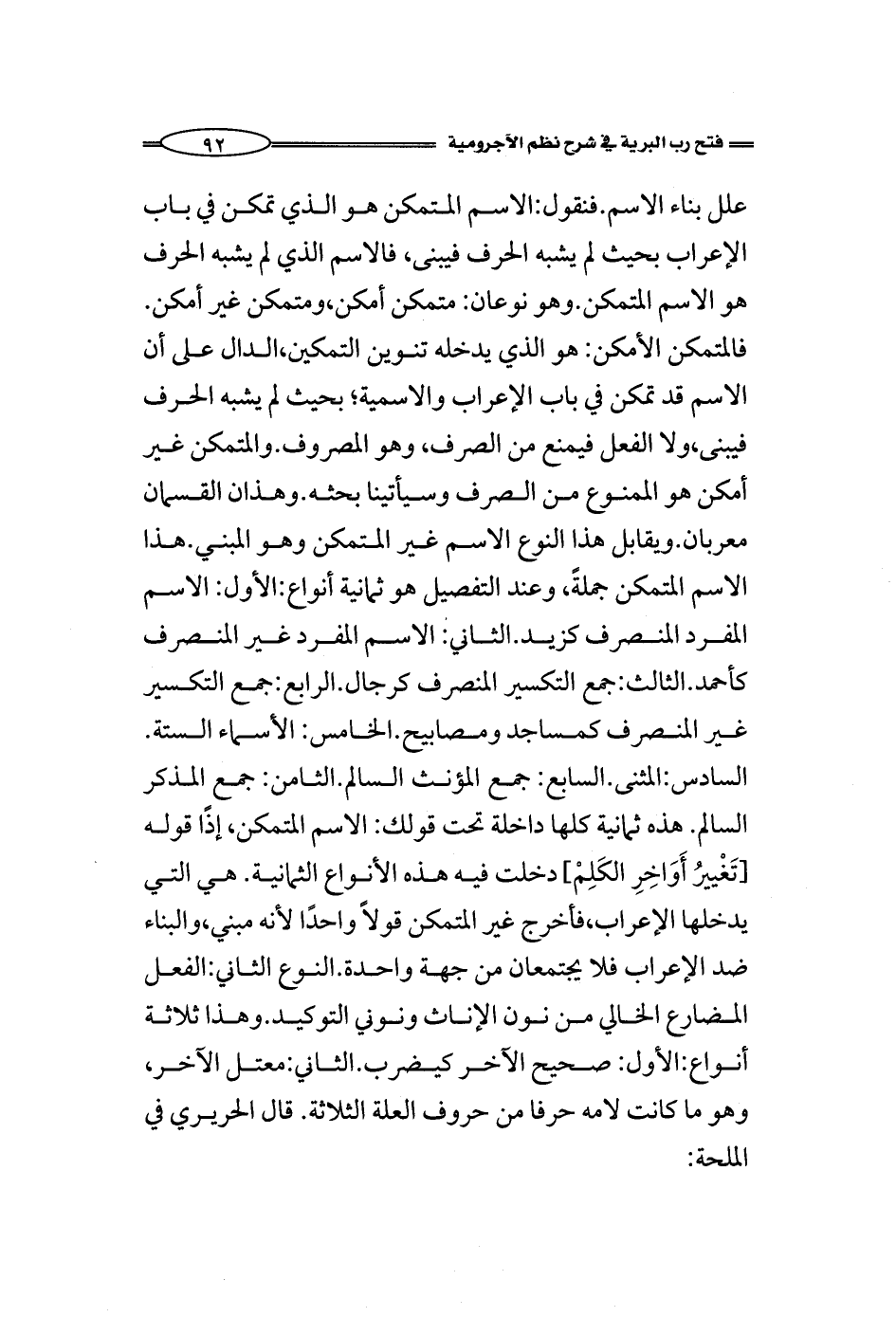 هذه ثمانية كلها داخلة تحت قولك: الاسم المتمكن، إذًا قوله [تَغْييرُ أَوَاخِرِ الكَلِمْ] دخلت فيه هذه الأنواع الثمانية. هي التي يدخلها الإعراب، فأخرج غير المتمكن قولاً واحدًا لأنه مبني، والبناء ضد الإعراب فلا يجتمعان من جهة واحدة. النوع الثاني: الفعل المضارع الخالي من نون الإناث ونوني التوكيد. وهذا ثلاثة أنواع: الأول: صحيح الآخر كيضرب. الثاني: معتل الآخر، وهو ما كانت لامه حرفا من حروف العلة الثلاثة. قال الحريري في الملحة: