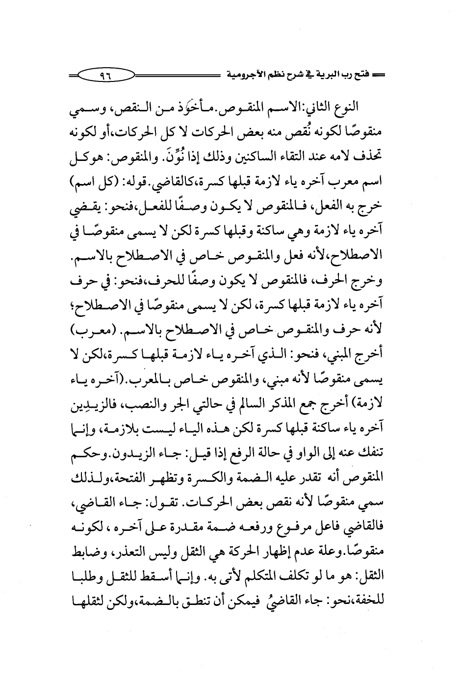 النوع الثاني: الاسم المنقوص. مأخوذ من النقص، وسمي منقوصًا لكونه نُقص منه بعض الحركات لا كل الحركات، أو لكونه تحذف لامه عند التقاء الساكنين وذلك إذا نون. والمنقوص: هوكل اسم معرب آخره ياء لازمة قبلها كسرة، كالقاضي. قوله: (كل اسم) خرج الفعل، فالمنقوص لا يكون وصفًا للفعل، فنحو: يقضي آخره ياء لازمة وهي ساكنة وقبلها كسرة لكن لا يسمى منقوصًا في الاصطلاح، لأنه فعل والمنقوص خاص في الاصطلاح بالاسم. وخرج الحرف، فالمنقوص لا يكون وصفًا للحرف، فنحو: في حرف آخره ياء لازمة قبلها كسرة، لكن لا يسمى منقوصًا في الاصطلاح؛ لأنه حرف والمنقوص خاص في الاصطلاح بالاسم. (معرب) أخرج المبني، فنحو: الذي آخره ياء لازمة قبلها كسرة، لكن لا يسمى منقوصًا لأنه مبني، والمنقوص خاص بالمعرب. (آخره ياء لازمة) أخرج جمع المذكر السالم في حالتي الجر والنصب، فالزيدِين آخره ياء ساكنة قبلها كسرة لكن هذه الياء ليست بلازمة، وإنما تنفك عنه إلى الواو في حالة الرفع إذا قيل: جاء الزيدون. وحكم المنقوص أنه تقدر عليه الضمة والكسرة وتظهر الفتحة، ولذلك سمي منقوصًا لأنه نقص بعض الحركات. تقول: جاء القاضي، فالقاضي فاعل مرفوع ورفعه ضمة مقدرة على آخره، لكونه منقوصًا. وعلة عدم إظهار الحركة هو الثقل وليس التعذر، وضابط الثقل: هو ما لو تكلف المتكلم لأتى به. وإنما أسقط للثقل وطلبا للخفة، نحو: جاء القاضيُ فيمكن أن تنطق بالضمة، ولكن لثقلها