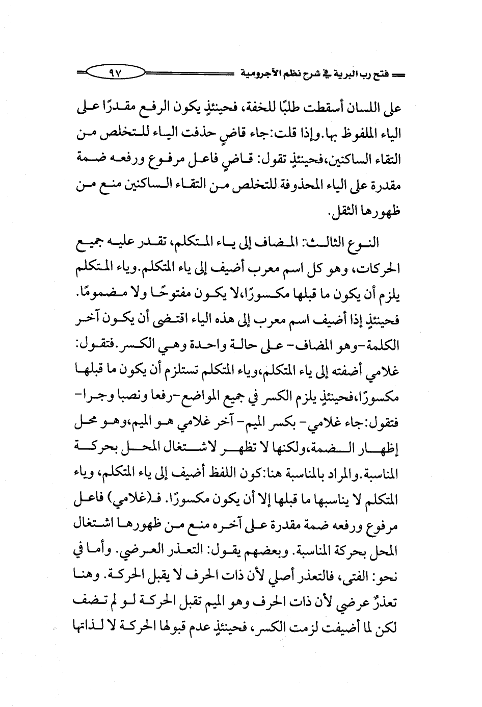 النوع الثالث: المضاف إلى ياء المتكلم، تقدر عليه جميع الحركات، وهو كل اسم معرب أضيف إلى ياء المتكلم. وياء المتكلم يلزم أن يكون ما قبلها مكسورًا، لا يكون مفتوحًا ولا مضمومًا. فحينئذٍ إذا أضيف اسم معرب إلى هذه الياء اقتضى أن يكون آخر الكلمة-وهي المضاف- على حالة واحدة وهي الكسر. فتقول: غلامي أضفته إلى ياء المتكلم، وياء المتكلم تستلزم أن يكون ما قبلها مكسورًا، فحينئذٍ يلزم الكسر في جميع المواضع-رفعا ونصبا وجرا- فتقول: جاء غلامي- بكسر الميم- آخر غلامي هو الميم، وهو محل إظهار الضمة، ولكنها لا تظهر لاشتغال المحل بحركة المناسبة. والمراد بالمناسبة هنا: كون اللفظ أضيف إلى ياء المتكلم، وياء المتكلم لا يناسبها ما قبلها إلا أن يكون مكسورًا. فـ (غلامي) فاعل مرفوع ورفعه ضمة مقدرة على آخره منع من ظهورها اشتغال المحل بحركة المناسبة. وبعضهم يقول: التعذر العرضي. وأما في نحو: الفتى، فالتعذر أصلي لأن ذات الحرف لا يقبل الحركة. وهنا تعذرٌ عرضي لأن ذات الحرف وهو الميم تقبل الحركة لو لم تضف لكن لما أضيفت لزمت الكسر، فحينئذٍ عدم قبولها الحركة لا لذاتها
