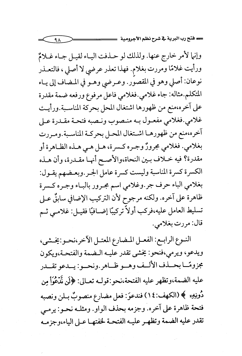 وإنما لأمر خارج عنها. ولذلك لو حذفت الياء لقيل جاء غلامٌ ورأيت غلامًا ومررت بغلامٍ. فهذا تعذر عرضي لا أصلي، فالتعذر نوعان: أصلي وهو في المقصور. وعرضي وهو في المضاف إلى ياء المتكلم. مثاله: جاء غلامي. فغلامي فاعل مرفوع ورفعه ضمة مقدرة على آخره، منع من ظهورها اشتغال المحل بحركة المناسبة. ورأيت غلامي. فغلامي مفعول به منصوب ونصبه فتحة مقدرة على آخره، منع من ظهورها اشتغال المحل بحركة المناسبة. ومررت بغلامي. فغلامي مجرورٌ وجره كسرة، هل هي هذه الظاهرة أم مقدرة؟ فيه خلاف بين النحاة، والأصح أنها مقدرة، وأن هذه الكسرة كسرة المناسبة وليست كسرة عامل الجر. وبعضهم يقول: بغلامي الباء حرف جر. وغلامي اسم مجرور بالباء وجره كسرة ظاهرة على آخره. ولكنه مرجوح لأن التركيب الإضافي سابقٌ على تسليط العامل عليه، فركب أولاً تركيبًا إضافيًا فقيل: غلامي ثم قال: مررت بغلامي.