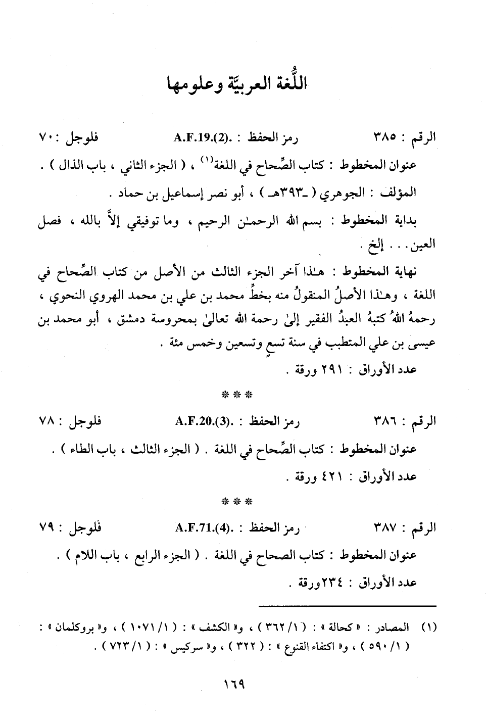 نهاية المخطوط: هذا آخر الجزء الثالث من الأصل من كتاب الصِّحاح في اللغة، وهذا الأصلُ المنقولُ منه بخط محمد بن علي بن محمد الهروي النحوي، رحمهُ اللَّهُ كتبهُ العبدُ الفقير إلى رحمة اللَّه تعالى بمحروسة دمشق، أبو محمد بن عيسى بن علي المتطبب في سنة تسعٍ وتسعين وخمس مئة.