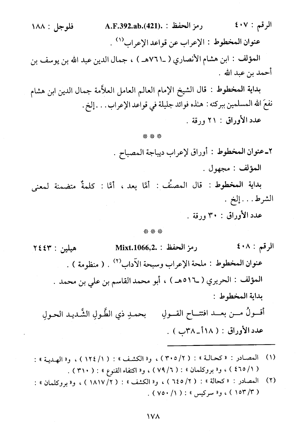 بداية المخطوط: قال الشيخ الإمام العالم العامل العلَّامة جمال الدين ابن هشام نفعَ اللَّه المسلمين ببركته: هذه فوائد جليلة في قواعد الإعراب. . . إلخ.