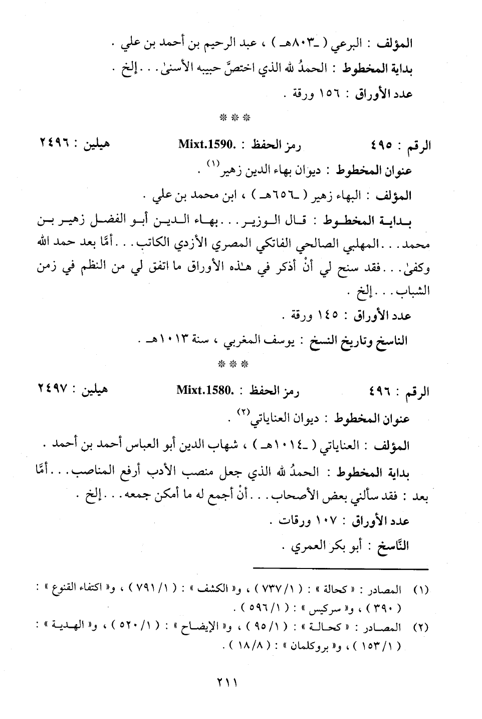 (¬1) المصادر: "كحالة": (1/ 737)، و"الكشف": (1/ 791)، و"اكتفاء القنوع": (390)، و"سركيس": (1/ 596).