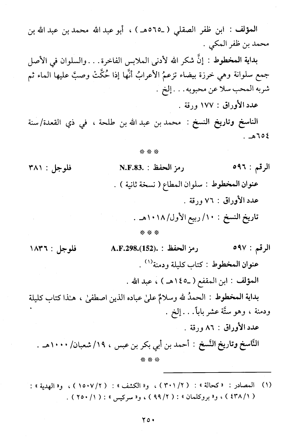 (¬1) المصادر: "كحالة": (2/ 301)، و"الكشف": (2/ 1507)، و"الهدية": (1/ 438)، و"بروكلمان": (2/ 99)، و"سركيس": (1/ 250).