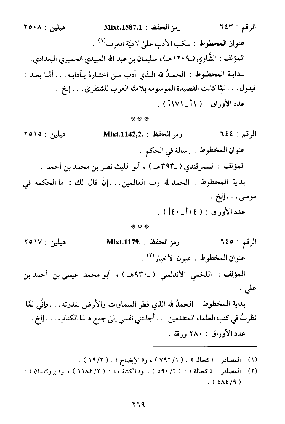 (¬2) المصادر: "كحالة": (2/ 590)، و"الكشف": (2/ 1184)، و"بروكلمان": (9/ 484).