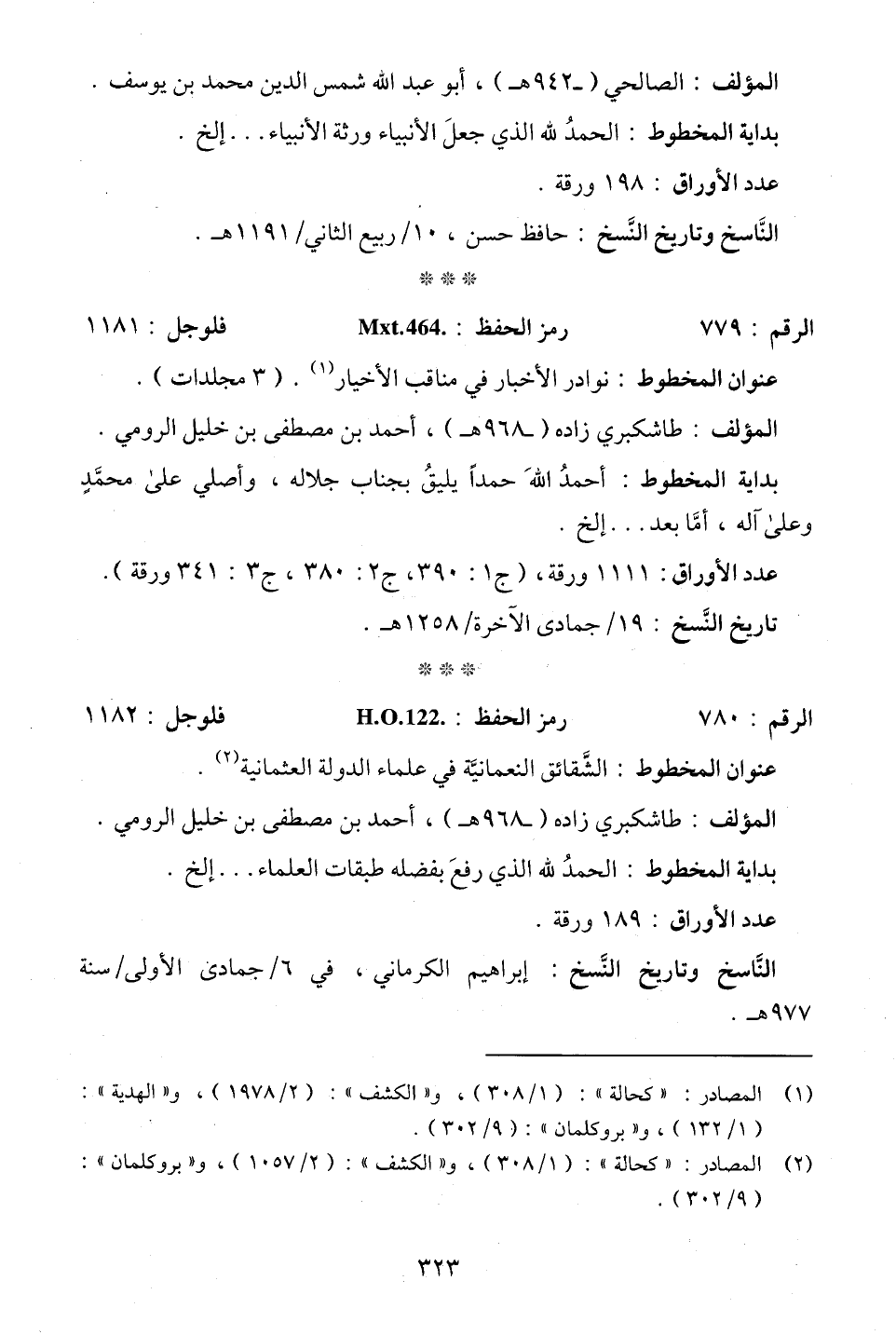 (¬1) المصادر: "كحالة": (1/ 308)، و"الكشف": (2/ 1978)، و"الهدية": (1/ 132)، و"بروكلمان": (9/ 302).