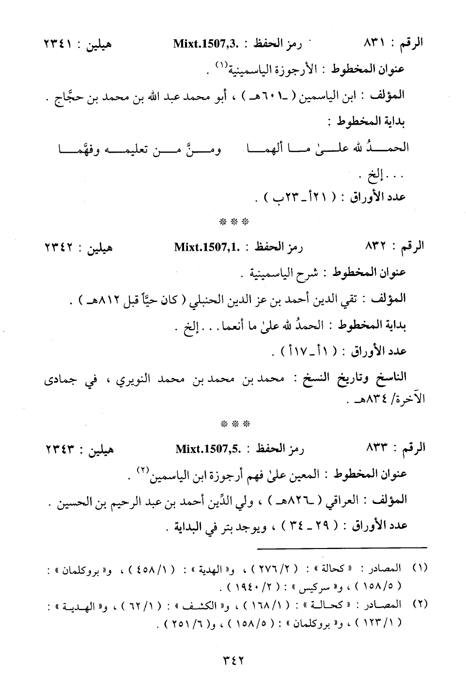 (¬1) المصادر: "كحالة": (2/ 276)، و"الهدية": (1/ 458)، و"بروكلمان": (5/ 158)، و"سركيس": (2/ 1940).