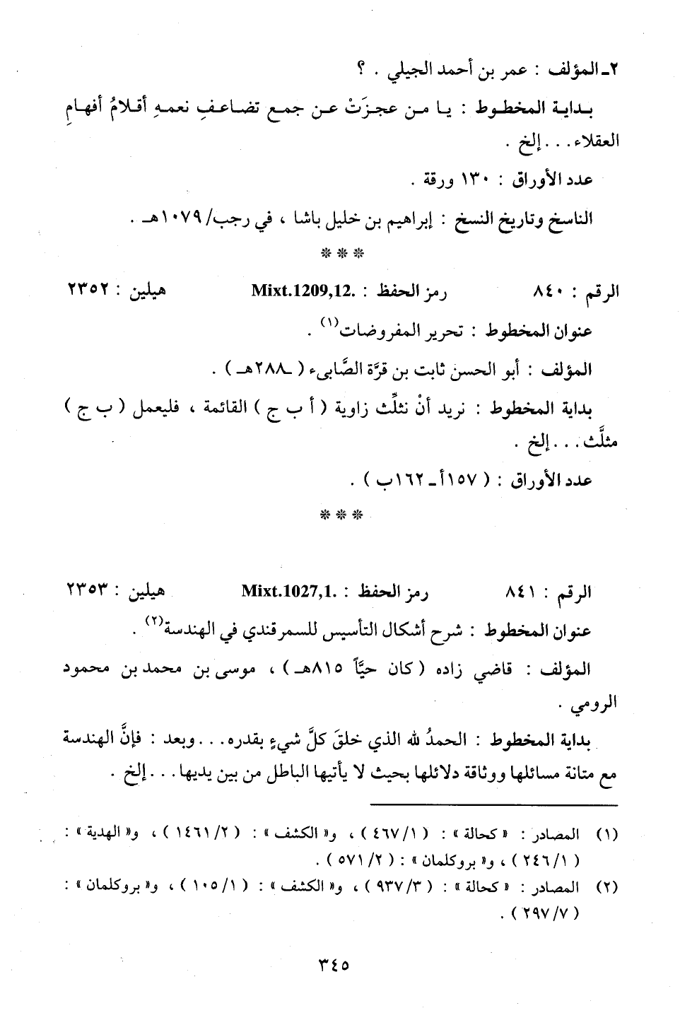 (¬1) المصادر: "كحالة": (1/ 467)، و"الكشف": (2/ 1461)، و"الهدية": (1/ 246)، و"بروكلمان": (2/ 571).