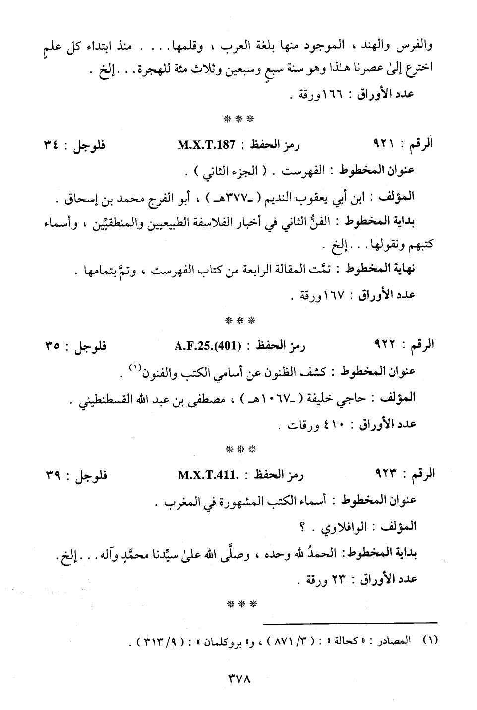 والفرس والهند، الموجود منها بلغة العرب، وقلمها. . . منذ ابتداء كل علمٍ اخترع إلى عصرنا هذا وهو سنة سبعٍ وسبعين وثلاث مئة للهجرة. . . إلخ.