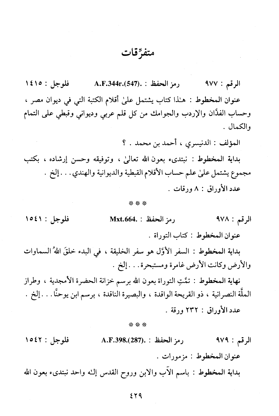 نهاية المخطوط: تمَّتِ التوراة بعون اللَّه برسم خزانة الحضرة الأمجدية، وطراز الملَّة النصرانية، ذو القريحة الواقدة، والبصيرة الناقدة، برسم ابن يوحنَّا. . . إلخ.
