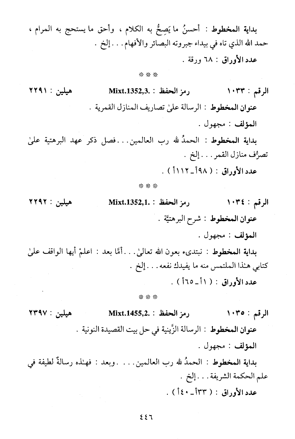 بداية المخطوط: الحمدُ للَّه رب العالمين. . . فصل ذكر عهد البرهتية على تصرُّف منازل القمر. . . إلخ.