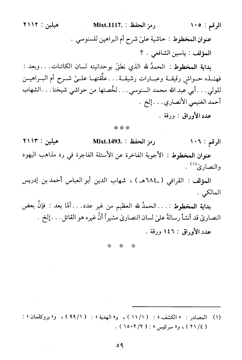 (¬1) المصادر: "الكشف": (1/ 11)، و"الهدية": (1/ 99)، و"بروكلمان": (4/ 21)، و"سركيس": (2/ 1502).