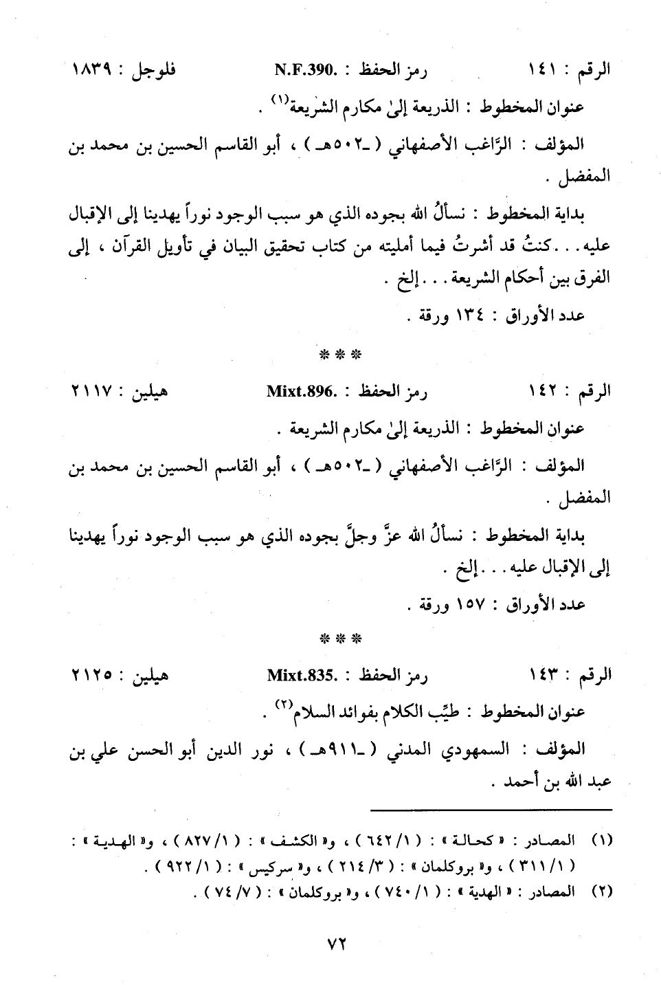 (¬1) المصادر: "كحالة": (1/ 642)، و"الكشف": (1/ 827)، و"الهدية": (1/ 311)، و"بروكلمان": (3/ 214)، و"سركيس": (1/ 922).