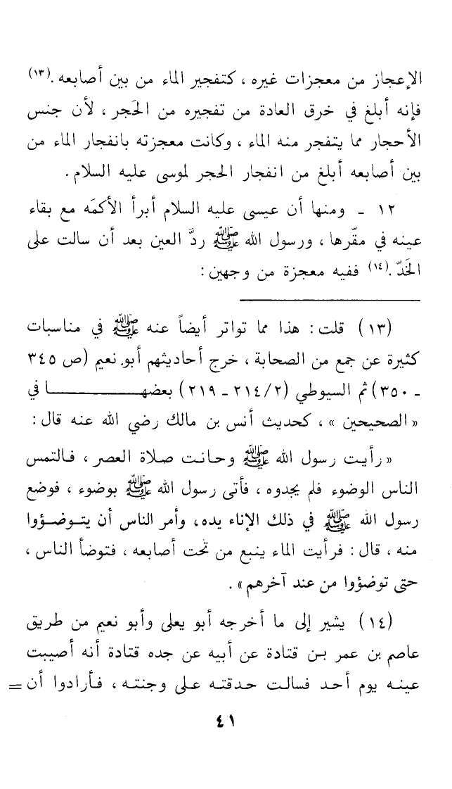 عن عاصم بن عمر بن قتادة عن أبيه عن جده قتادة ابن النعمان أنه أصيبت عينه يوم بدر فسالت حدقته على وجنته فأرادوا أن يقطعوها فسألوا النبي A فقال: (لا فدعا به فغمز عينيه براحته)