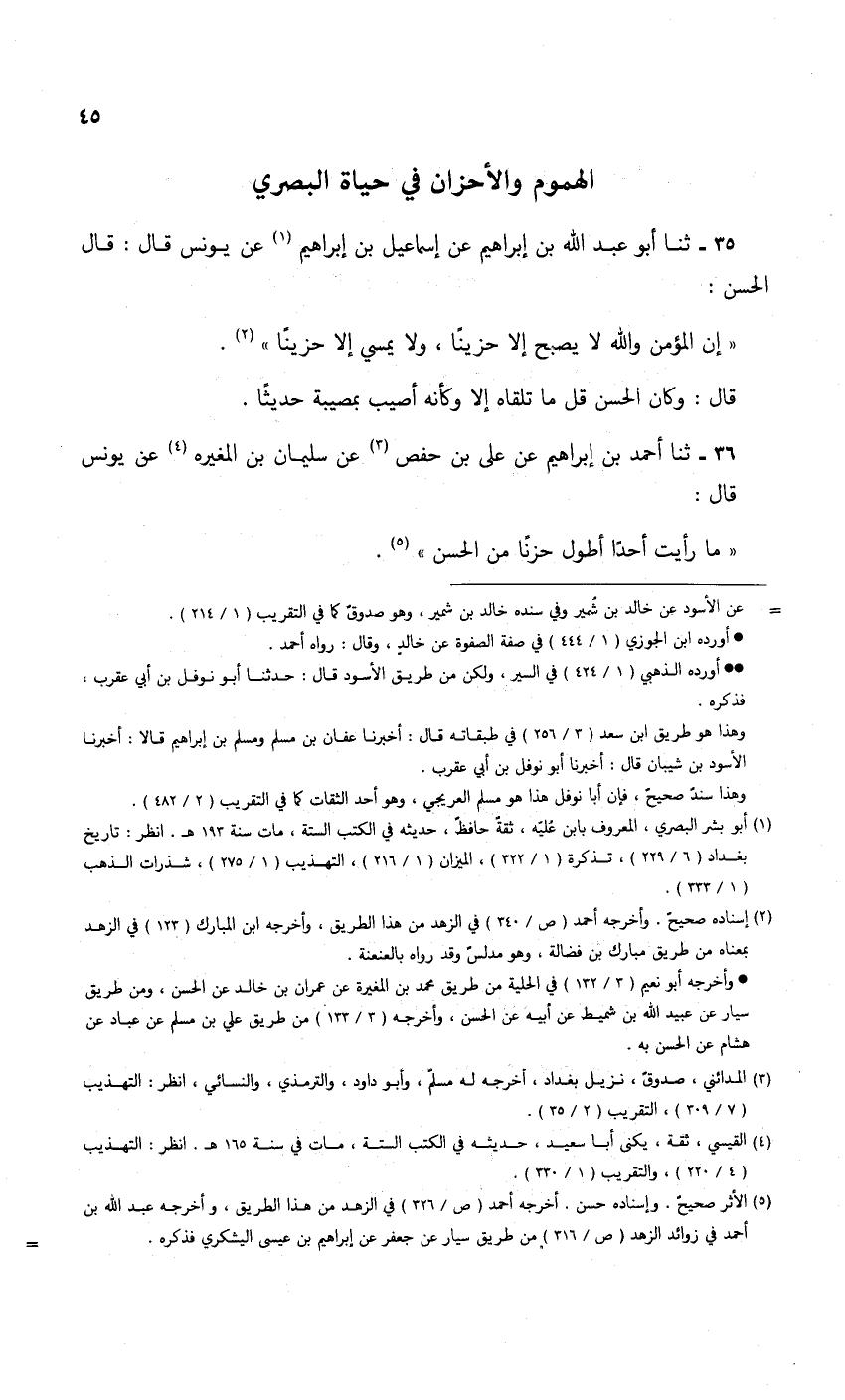 35 - ثنا أَبُو عَبْدِ اللَّهِ بْنُ إِبْرَاهِيمَ، عَنْ إِسْمَاعِيلَ بْنِ إِبْرَاهِيمَ، عَنْ يُونُسَ، قَالَ: قَالَ الْحَسَنُ: «إِنَّ §الْمُؤْمِنَ وَاللَّهِ لَا يُصْبِحُ إِلَّا حَزِينًا، وَلَا يُمْسِي إِلَّا حَزِينًا» قَالَ: وَكَانَ الْحَسَنُ، قَلَّ مَا تَلَقَّاهُ إِلَّا وَكَأَنَّهُ أُصِيبَ بِمُصِيبَةٍ حَدِيثًا