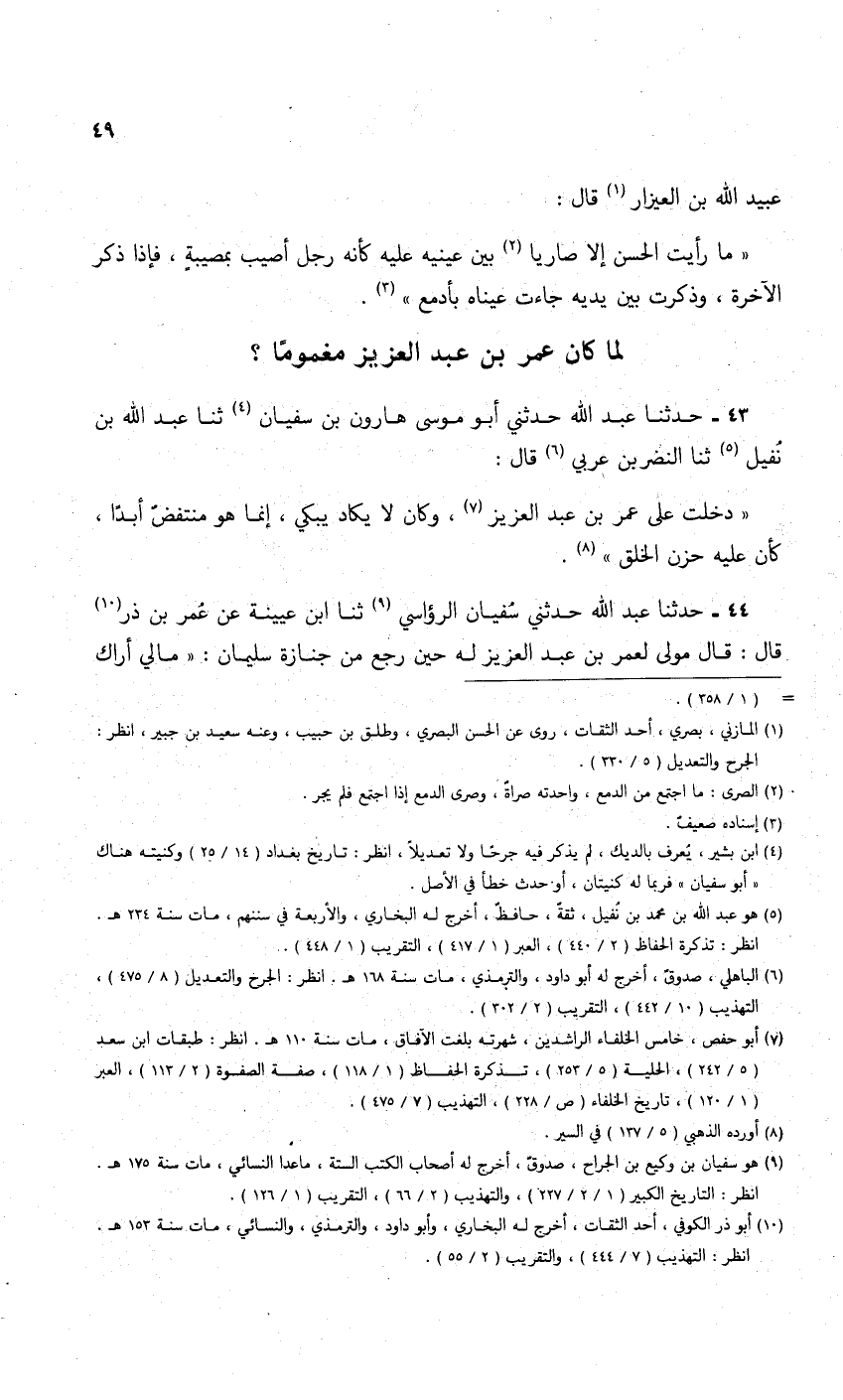 43 - حَدَّثَنَا عَبْدُ اللَّهِ حَدَّثَنِي أَبُو مُوسَى هَارُونُ بْنُ سُفْيَانَ، ثنا عَبْدُ اللَّهِ بْنُ نُفَيْلٍ، ثنا النَّضْرُ بْنُ عَرَبِيٍّ، قَالَ: «§دَخَلْتُ عَلَى عُمَرَ بْنِ عَبْدِ الْعَزِيزِ،» وَكَانَ لَا يَكَادُ يَبْكِي، إِنَّمَا هُوَ مُنْتَفِضٌ أَبَدًا كَأَنَّ عَلَيْهِ حُزْنُ الْخَلْقِ "