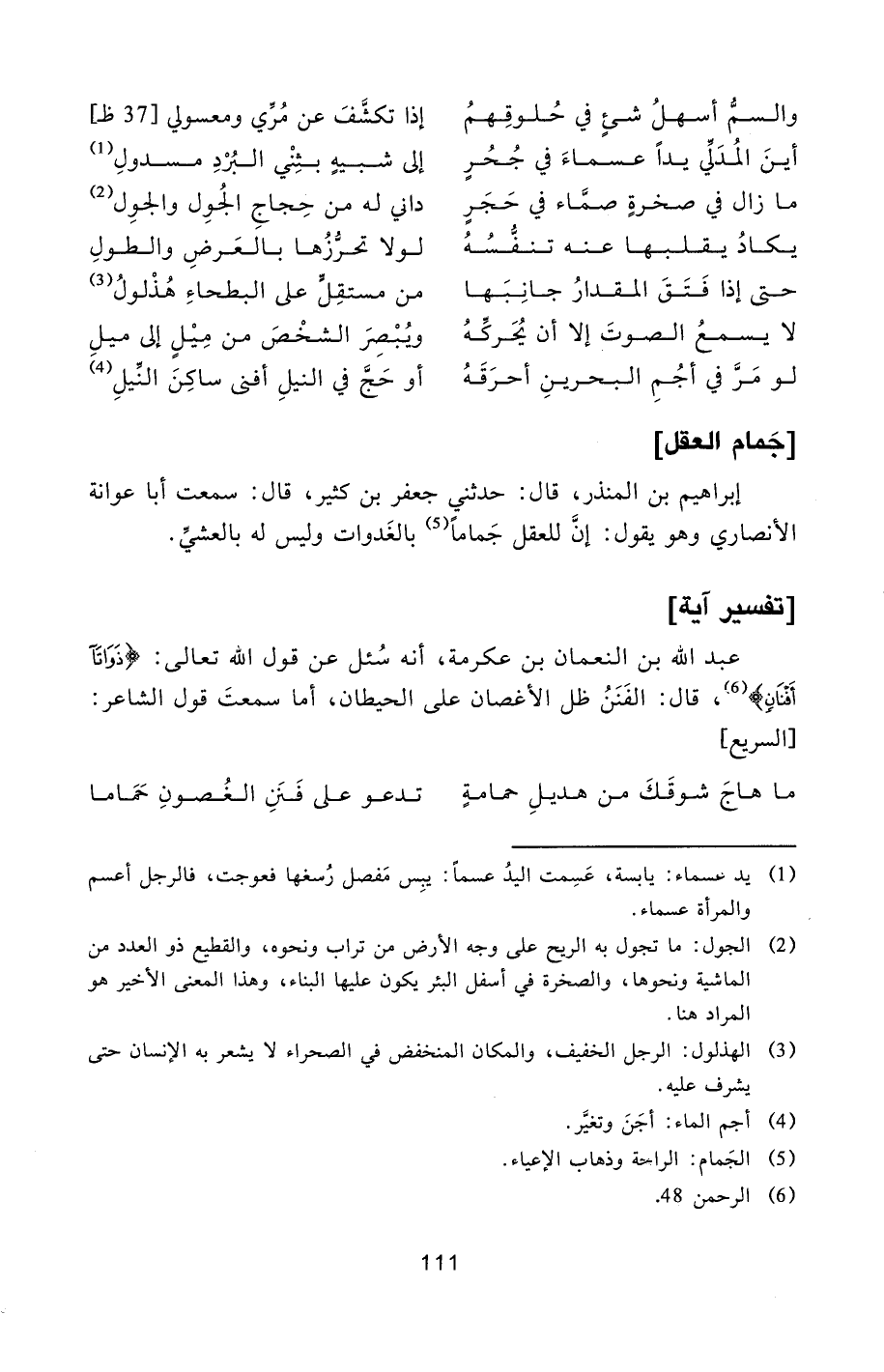 إبراهيم بن المنذر، قال: حدثني جعفر بن كثير، قال: سمعت أبا عوانة الأنصاري وهو يقول: إنّ للعقل جماما [5] بالغدوات وليس له بالعشيّ.