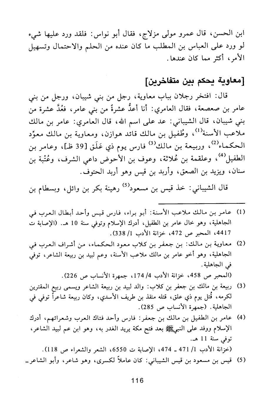 قال: افتخر رجلان بباب معاوية، رجل من بني شيبان، ورجل من بني عامر بن صعصعة، فقال العامري: أنا أعدّ عشرة من بني عامر، فعدّ عشرة من بني شيبان، قال الشيباني: عد على اسم الله، قال العامري: عامر بن مالك ملاعب الأسنة [1] ، وطفيل بن مالك قائد هوازن، ومعاوية بن مالك معوّد الحكماء [2] ، وربيعة بن مالك [3] فارس يوم ذي علق [39 ظ] ، وعامر بن الطفيل [4] ، وعلقمة بن علاثة، وعوف بن الأحوض داعي الشرف، وعتبة بن سنان، ويزيد بن الصعق، وأربد بن قيس وهو أربد الحتوف.