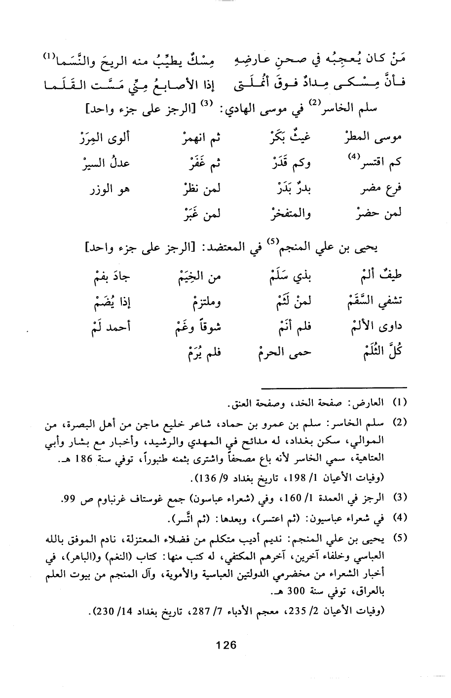 [5] يحيى بن علي المنجم: نديم أديب متكلم من فضلاء المعتزلة، نادم الموفق بالله العباسي وخلفاء آخرين، آخرهم المكتفي، له كتب منها: كتاب (النغم) و (الباهر) ، في أخبار الشعراء من مخضرمي الدولتين العباسية والأموية، وآل المنجم من بيوت العلم بالعراق، توفي سنة 300 هـ.